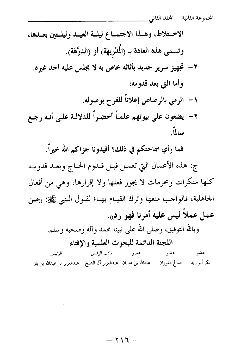 ج: هذه الأعمال التي تعمل قبل قدوم الحاج وبعد قدومه كلها منكرات ومحرمات لا يجوز فعلها ولا إقرارها، وهي من أفعال الجاهلية، فالواجب منعها وترك القيام بها؟ لقول النبي - صلى الله عليه وسلم -: «من عمل عملا ليس عليه أمرنا فهو رد (¬1) » .