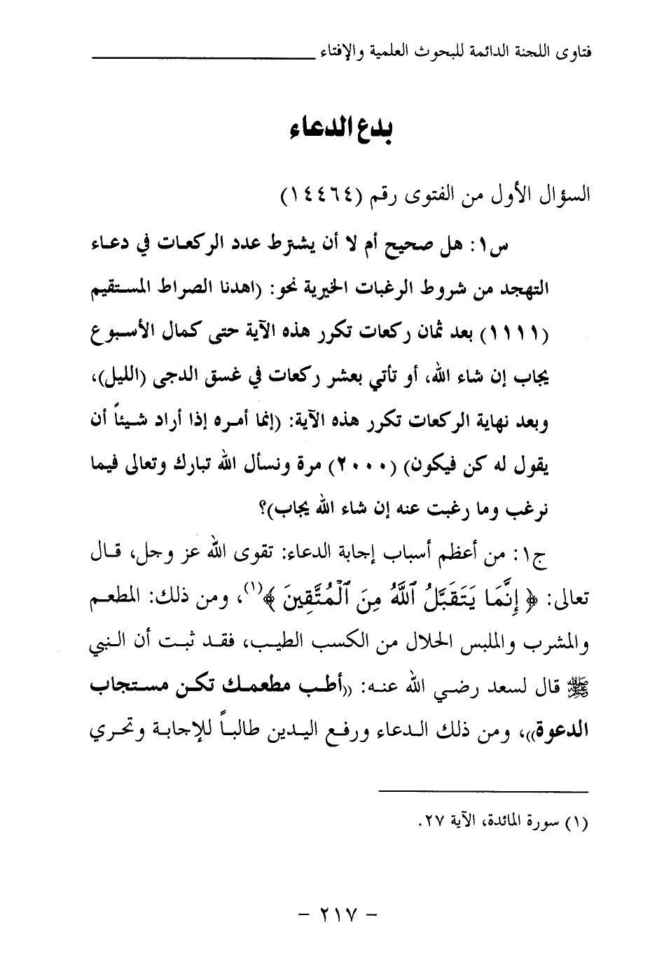 س1: هل صحيح أم لا أن يشترط عدد الركعات في دعاء التهجد من شروط الرغبات الخيرية نحو: (اهدنا الصراط المستقيم (1111) بعد ثماني ركعات تكرر هذه الآية حتى كمال الأسبوع يجاب إن شاء الله، أو تأتي بعشر ركعات في غسق الدجى (الليل) ، وبعد نهاية الركعات تكرر هذه الآية: (إنما أمره إذا أراد شيئا أن يقول له كن فيكون) (2000) مرة ونسأل الله تبارك وتعالى فيما نرغب وما رغبت عنه إن شاء الله يجاب) ؟