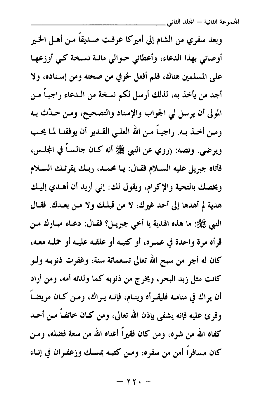 وبعد سفري من الشام إلى أميركا عرفت صديقا من أهل الخير أوصاني بهذا الدعاء، وأعطاني حوالي مائة نسخة كي أوزعها على المسلمين هناك، فلم أفعل لخوفي من صحته ومن إسناده، ولا أجد من يأخذ به، لذلك أرسل لكم نسخة من الدعاء راجيا من المولى أن يرسل لي الجواب والإسناد والتصحيح، ومن حدث به ومن أخذ به. راجيا من الله العلي القدير أن يوفقنا لما يحب ويرضى. ونصه: (روي عن النبي - صلى الله عليه وسلم - أنه كان جالسا في المجلس، فأتاه جبريل عليه السلام فقال: يا محمد، ربك يقرئك السلام ويخصك بالتحية والإكرام، ويقول لك: إني أريد أن أهدي إليك هدية لم أهدها إلى أحد غيرك، لا من قبلك ولا من بعدك. فقال النبي - صلى الله عليه وسلم -: ما هذه الهدية يا أخي جبريل؟ فقال: دعاء مبارك من قرأه مرة واحدة في عمره، أو كتبه أو علقه عليه أو حمله معه، كان له أجر من سبح الله تعالى تسعمائة سنة، وغفرت ذنوبه ولو كانت مثل زبد البحر، ويخرج من ذنوبه كما ولدته أمه، ومن أراد أن يراك في منامه فليقرأه وينام، فإنه يراك، ومن كان مريضا وقرئ عليه فإنه يشفى بإذن الله تعالى، ومن كان خائفا من أحد كفاه الله من شره، ومن كان فقيرا أغناه الله من سعة فضله، ومن كان مسافرا أمن من سفره، ومن كتبه بمسك وزعفران في إناء