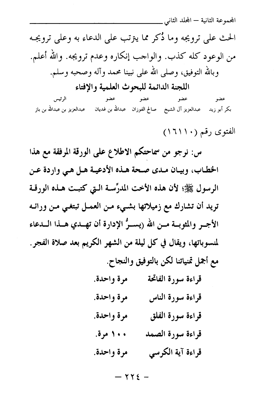 س: نرجو من سماحتكم الاطلاع على الورقة المرفقة مع هذا الخطاب، وبيان مدى صحة هذه الأدعية هل هي واردة عن الرسول - صلى الله عليه وسلم - لأن هذه الأخت المدرسة التي كتبت هذه الورقة تريد أن تشارك مع زميلاتها بشيء من العمل تبتغي من ورائه الأجر والمثوبة من الله (يسر الإدارة أن تهدي هذا الدعاء لمنسوباتها، ويقال في كل ليلة من الشهر الكريم بعد صلاة الفجر. مع أجمل تمنياتنا لكن بالتوفيق والنجاح.