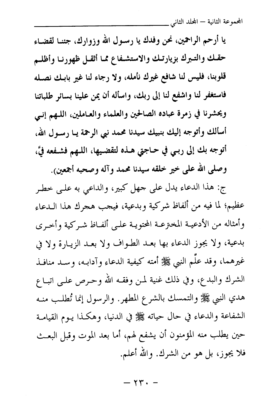 ج: هذا الدعاء يدل على جهل كبير، والداعي به على خطر عظيم؛ لما فيه من ألفاظ شركية وبدعية، فيجب هجرك هذا الدعاء وأمثاله من الأدعية المخترعة المحتوية على ألفاظ شركية وأخرى بدعية، ولا يجوز الدعاء بها بعد الطواف ولا بعد الزيارة ولا في غيرهما، وقد علم النبي - صلى الله عليه وسلم - أمته كيفية الدعاء وآدابه، وسد منافذ الشرك والبدع، وفي ذلك غنية لمن وفقه الله وحرص على اتباع هدي النبي - صلى الله عليه وسلم - والتمسك بالشرع المطهر. والرسول إنما تطلب منه الشفاعة والدعاء في حال حياته - صلى الله عليه وسلم - في الدنيا، وهكذا يوم القيامة حين يطلب منه المؤمنون أن يشفع لهم، أما بعد الموت وقبل البعث فلا يجوز، بل هو من الشرك. والله أعلم.