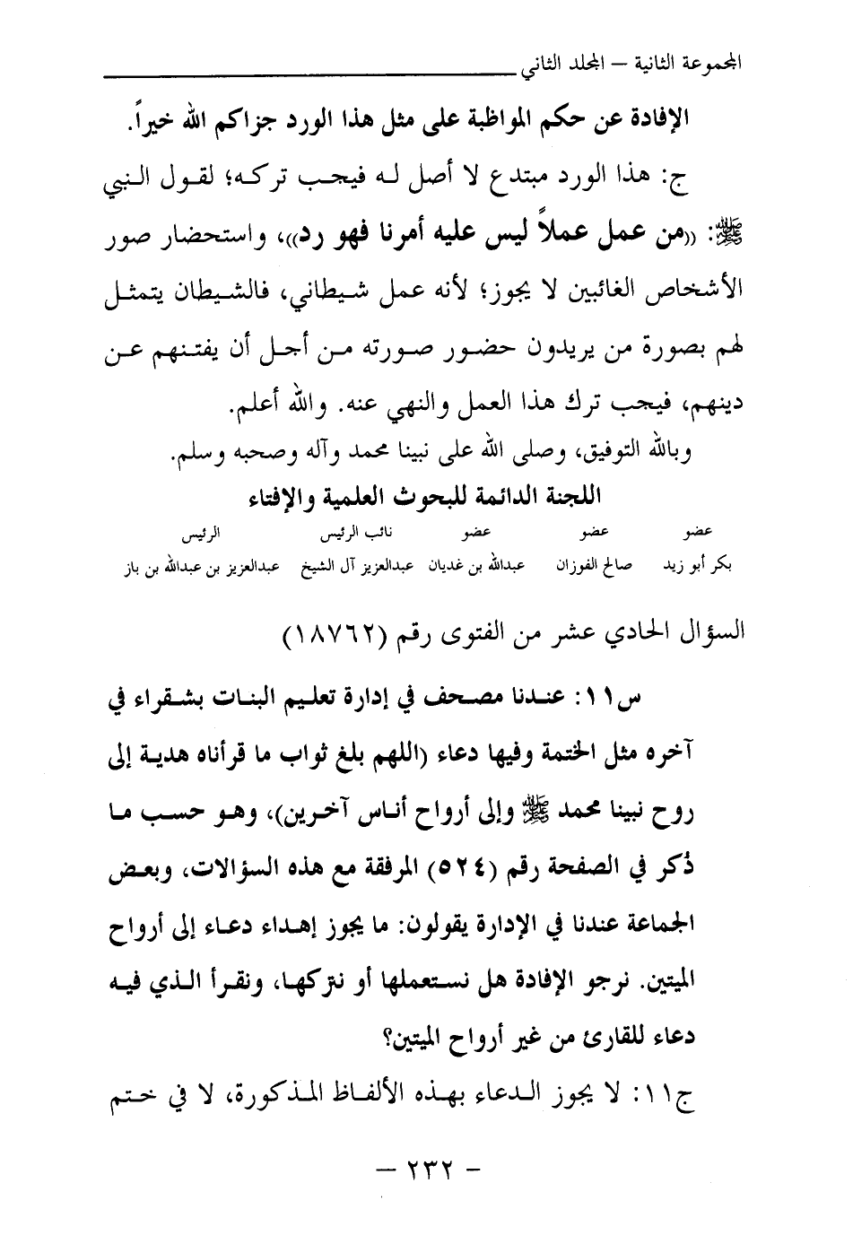 س11: عندنا مصحف في إدارة تعليم البنات بشقراء في آخره مثل الختمة وفيها دعاء (اللهم بلغ ثواب ما قرأناه هدية إلى روح نبينا محمد - صلى الله عليه وسلم - وإلى أرواح أناس آخرين) ، وهو حسب ما ذكر في الصفحة رقم (524) المرفقة مع هذه السؤالات، وبعض الجماعة عندنا في الإدارة يقولون: ما يجوز إهداء دعاء إلى أرواح الميتين. نرجو الإفادة هل نستعملها أو نتركها، ونقرأ الذي فيه دعاء للقارئ من غير أرواح الميتين؟