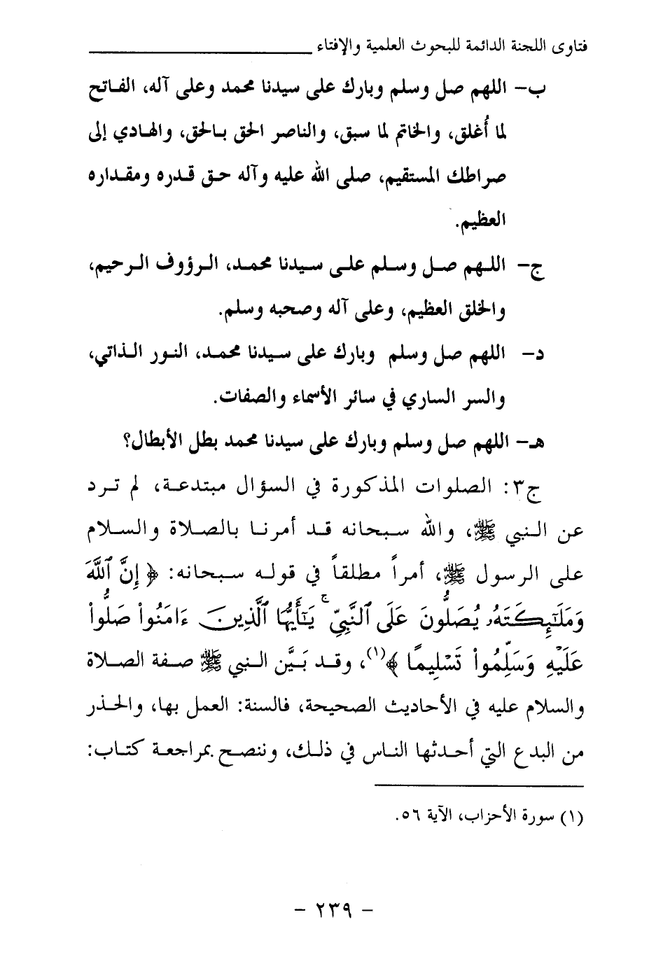 ب- اللهم صل وسلم وبارك على سيدنا محمد وعلى آله، الفاتح لما أغلق، والخاتم لما سبق، والناصر الحق بالحق، والهادي إلى صراطك المستقيم، صلى الله عليه وآله حق قدره ومقداره العظيم.