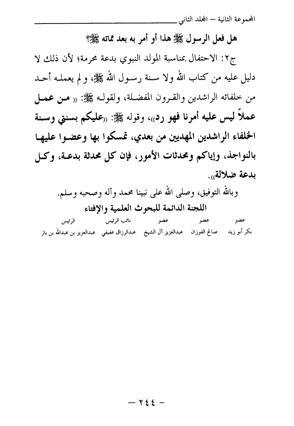 ج2: الاحتفال بمناسبة المولد النبوي بدعة محرمة؛ لأن ذلك لا دليل عليه من كتاب الله ولا سنة رسول الله - صلى الله عليه وسلم -، ولم يعمله أحد من خلفائه الراشدين والقرون المفضلة، ولقوله - صلى الله عليه وسلم -: «من عمل عملا ليس عليه أمرنا فهو رد (¬1) » ، وقوله - صلى الله عليه وسلم -: «عليكم بسنتي وسنة الخلفاء الراشدين المهديين من بعدي، تمسكوا بها وعضوا عليها بالنواجذ، وإياكم ومحدثات الأمور، فإن كل محدثة بدعة، وكل بدعة ضلالة (¬2) » .