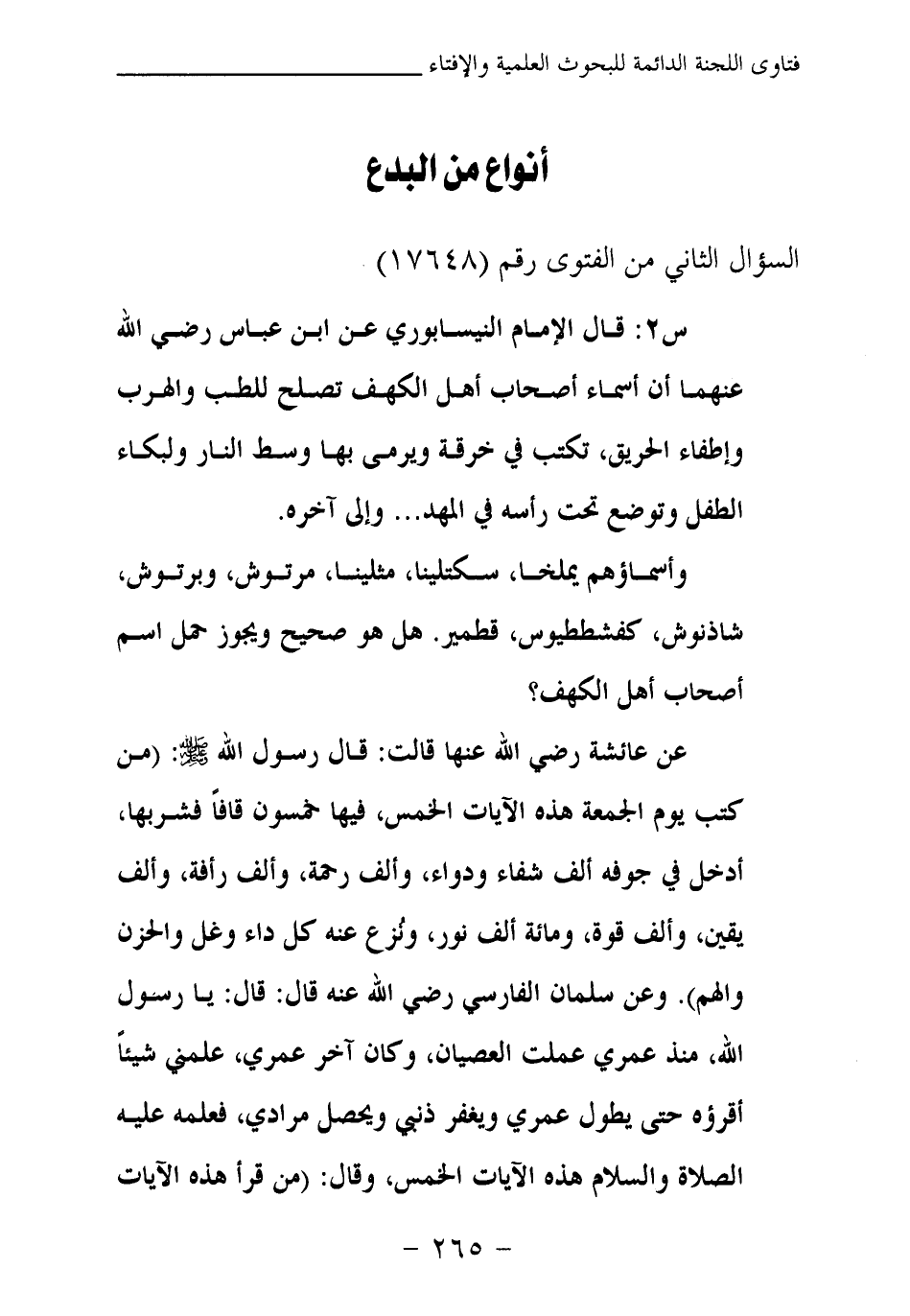 س 2: قال الإمام النيسابوري عن ابن عباس رضي الله عنهما أن أسماء أصحاب أهل الكهف تصلح للطب والهرب وإطفاء الحريق، تكتب في خرقة ويرمى بها وسط النار ولبكاء الطفل وتوضع تحت رأسه في المهد.. . وإلى آخره.