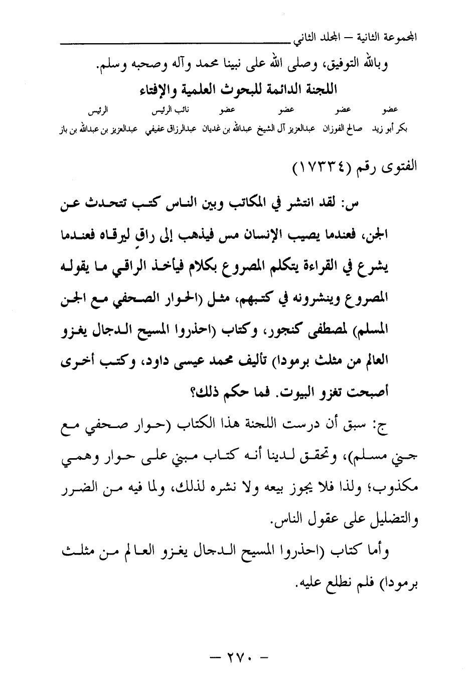 ج: سبق أن درست اللجنة هذا الكتاب (حوار صحفي مع جني مسلم) ، وتحقق لدينا أنه كتاب مبني على حوار وهمي مكذوب؛ ولذا فلا يجوز بيعه ولا نشره لذلك، ولما فيه من الضرر والتضليل على عقول الناس.