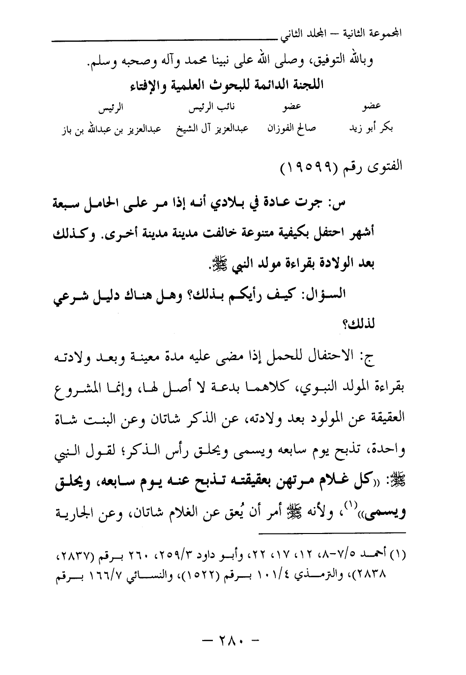 ج: الاحتفال للحمل إذا مضى عليه مدة معينة وبعد ولادته بقراءة المولد النبوي، كلاهما بدعة لا أصل لها، وإنما المشروع العقيقة عن المولود بعد ولادته، عن الذكر شاتان وعن البنت شاة واحدة، تذبح يوم سابعه ويسمى ويحلق رأس الذكر؛ لقول النبي صلى الله عليه وسلم: «كل غلام مرتهن بعقيقته تذبح عنه يوم سابعه، ويحلق ويسمى (¬1) » ، ولأنه صلى الله عليه وسلم أمر أن يعق عن الغلام شاتان، وعن الجارية
