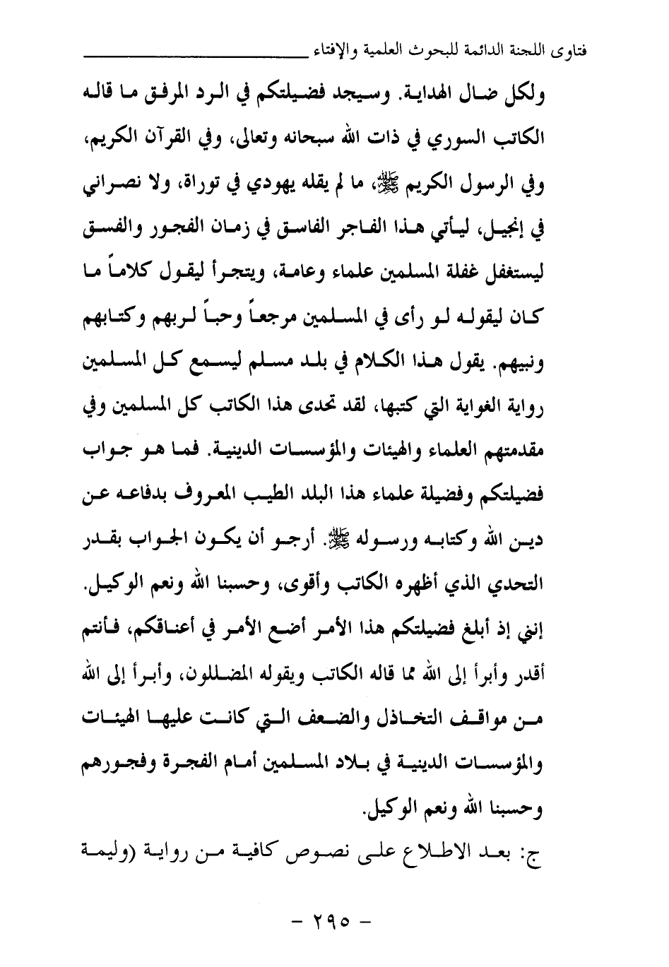 ولكل ضال الهداية. وسيجد فضيلتكم في الرد المرفق ما قاله الكاتب السوري في ذات الله سبحانه وتعالى، وفي القرآن الكريم، وفي الرسول الكريم صلى الله عليه وسلم، ما لم يقله يهودي في توراة، ولا نصراني في إنجيل، ليأتي هذا الفاجر الفاسق في زمان الفجور والفسق ليستغفل غفلة المسلمين علماء وعامة، ويتجرأ ليقول كلاما ما كان ليقوله لو رأى في المسلمين مرجعا وحبا لربهم وكتابهم ونبيهم. يقول هذا الكلام في بلد مسلم ليسمع كل المسلمين رواية الغواية التي كتبها، لقد تحدى هذا الكاتب كل المسلمين وفي مقدمتهم العلماء والهيئات والمؤسسات الدينية. فما هو جواب فضيلتكم وفضيلة علماء هذا البلد الطيب المعروف بدفاعه عن دين الله وكتابه ورسوله صلى الله عليه وسلم. أرجو أن يكون الجواب بقدر التحدي الذي أظهره الكاتب وأقوى، وحسبنا الله ونعم الوكيل. إنني إذ أبلغ فضيلتكم هذا الأمر أضع الأمر في أعناقكم، فأنتم أقدر، وأبرأ إلى الله مما قاله الكاتب ويقوله المضللون، وأبرأ إلى الله من مواقف التخاذل والضعف التي كانت عليها الهيئات والمؤسسات الدينية في بلاد المسلمين أمام الفجرة وفجورهم وحسبنا الله ونعم الوكيل.