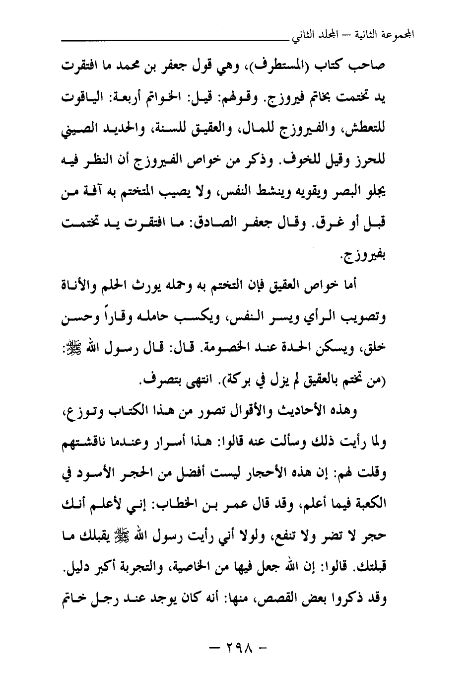 صاحب كتاب (المستطرف) ، وهي قول جعفر بن محمد ما افتقرت يد تختمت بخاتم فيروزج. وقولهم: قيل: الخواتم أربعة: الياقوت للتعطش، والفيروزج للمال، والعقيق للسنة، والحديد الصيني للحرز وقيل للخوف. وذكر من خواص الفيروزج أن النظر فيه يجلو البصر ويقويه وينشط النفس، ولا يصيب المتختم به آفة من قبل أو غرق. وقال جعفر الصادق: ما افتقرت يد تختمت بفيروزج.