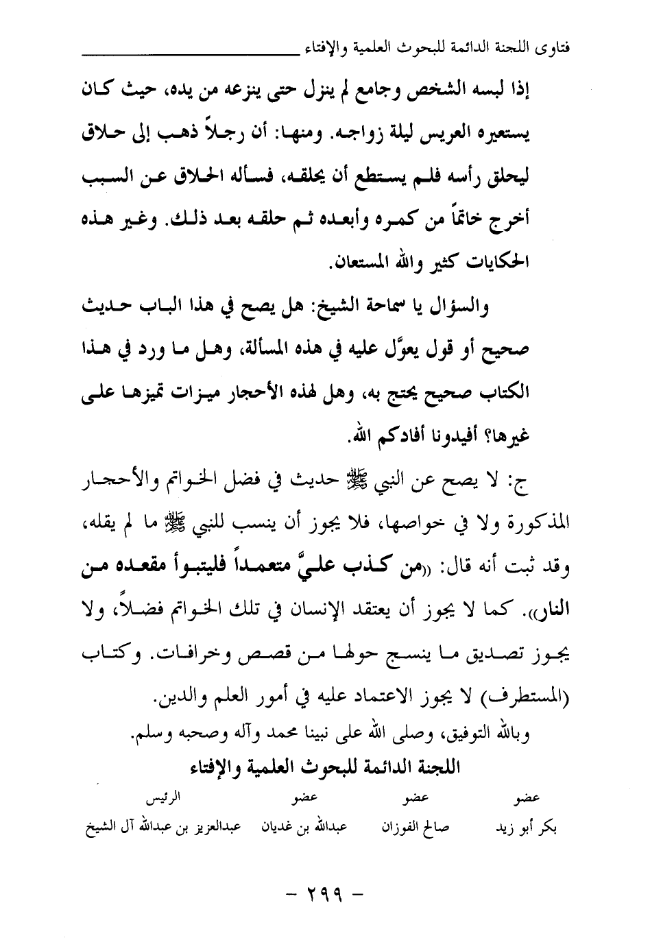 ج: لا يصح عن النبي صلى الله عليه وسلم حديث في فضل الخواتم والأحجار المذكورة ولا في خواصها، فلا يجوز أن ينسب للنبي صلى الله عليه وسلم ما لم يقله، وقد ثبت أنه قال: «من كذب علي متعمدا فليتبوأ مقعده من النار (¬1) » . كما لا يجوز أن يعتقد الإنسان في تلك الخواتم فضلا، ولا يجوز تصديق ما ينسج حولها من قصص وخرافات. وكتاب (المستطرف) لا يجوز الاعتماد عليه في أمور العلم والدين.
