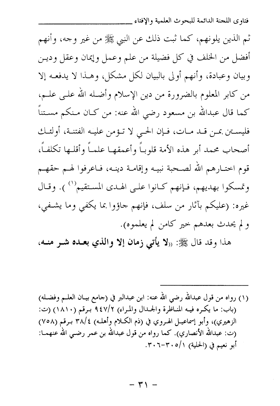 ثم الذين يلونهم، كما ثبت ذلك عن النبي صلى الله عليه وسلم من غير وجه، وأنهم أفضل من الخلف في كل فضيلة من علم وعمل وإيمان وعقل ودين وبيان وعبادة، وأنهم أولى بالبيان لكل مشكل، وهذا لا يدفعه إلا من كابر المعلوم بالضرورة من دين الإسلام وأضله الله على علم، كما قال عبد الله بن مسعود رضي الله عنه: من كان منكم مستنا فليستن بمن قد مات، فإن الحي لا تؤمن عليه الفتنة، أولئك أصحاب محمد أبر هذه الأمة قلوبا وأعمقها علما وأقلها تكلفا، قوم اختارهم الله لصحبة نبيه وإقامة دينه، فاعرفوا لهم حقهم وتمسكوا بهديهم، فإنهم كانوا على الهدى المستقيم) . وقال غيره: (عليكم بآثار من سلف، فإنهم جاؤوا بما يكفي وما يشفي، ولم يحدث بعدهم خير كامن لم يعلموه) .
