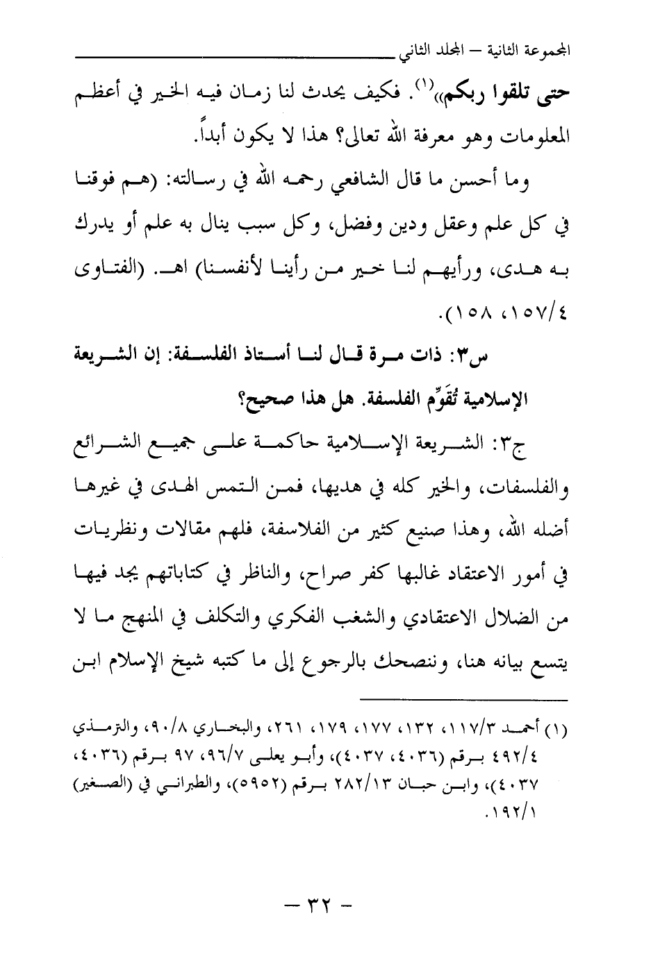 وما أحسن ما قال الشافعي رحمه الله في رسالته: (هم فوقنا في كل علم وعقل ودين وفضل، وكل سبب ينال به علم أو يدرك به هدى، ورأيهم لنا خير من رأينا لأنفسنا) اهـ. (الفتاوى 4 \ 157، 158) .