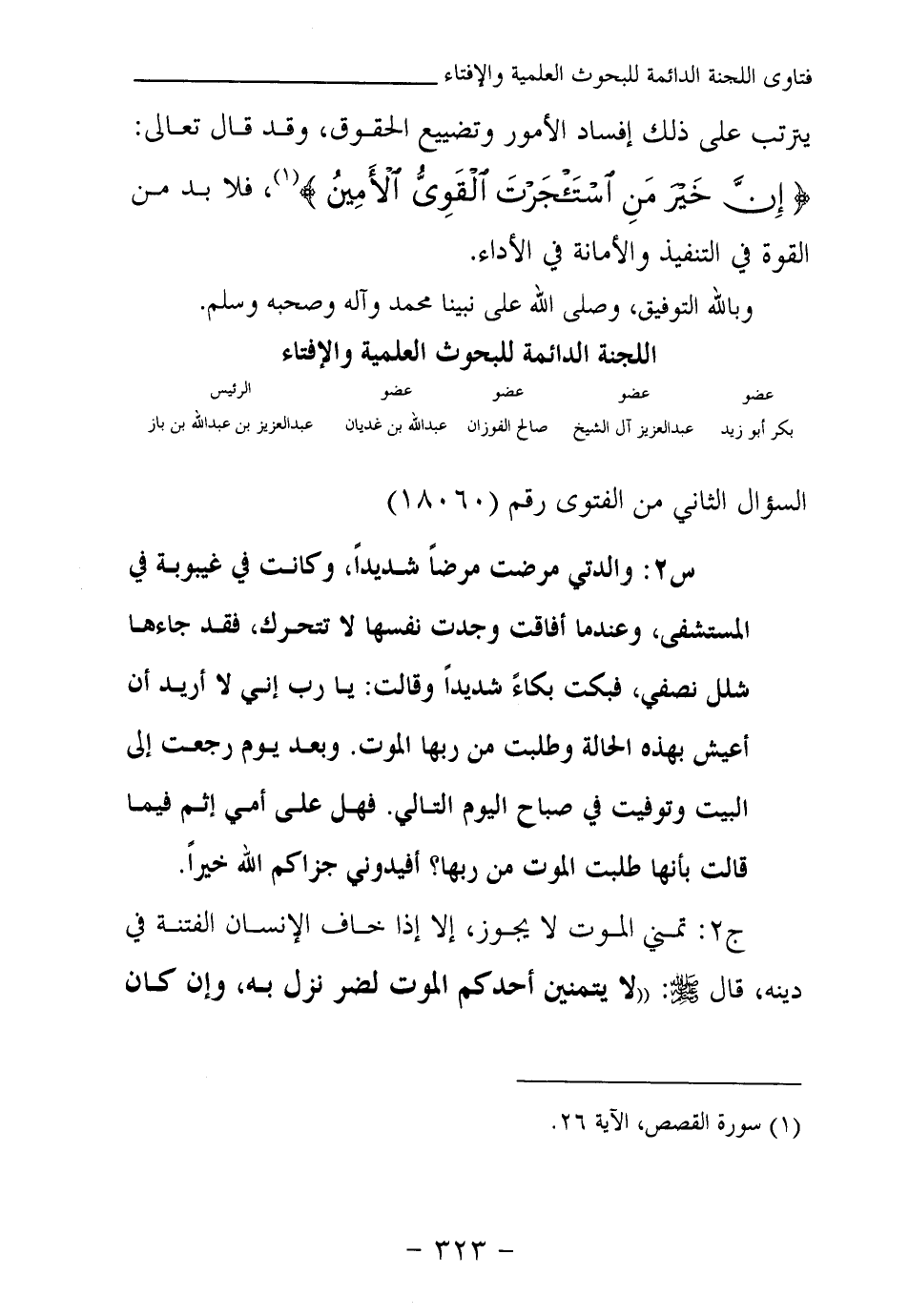 س 2: والدتي مرضت مرضا شديدا، وكانت في غيبوبة في المستشفى، وعندما أفاقت وجدت نفسها لا تتحرك، فقد جاءها شلل نصفي، فبكت بكاء شديدا وقالت: يا رب إني لا أريد أن أعيش بهذه الحالة وطلبت من ربها الموت. وبعد يوم رجعت إلى البيت وتوفيت في صباح اليوم التالي. فهل على أمي إثم فيما قالت بأنها طلبت الموت من ربها؟ أفيدوني جزاكم الله خيرا.