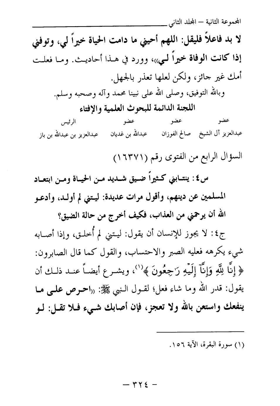 ج 4: لا يجوز للإنسان أن يقول: ليتني لم أخلق، وإذا أصابه شيء يكرهه فعليه الصبر والاحتساب، والقول كما قال الصابرون: {إِنَّا لِلَّهِ وَإِنَّا إِلَيْهِ رَاجِعُونَ} (¬1) ، ويشرع أيضا عند ذلك أن يقول: قدر الله وما شاء فعل، لقول النبي صلى الله عليه وسلم: «احرص على ما ينفعك واستعن بالله ولا تعجز، فإن أصابك شيء فلا تقل: لو