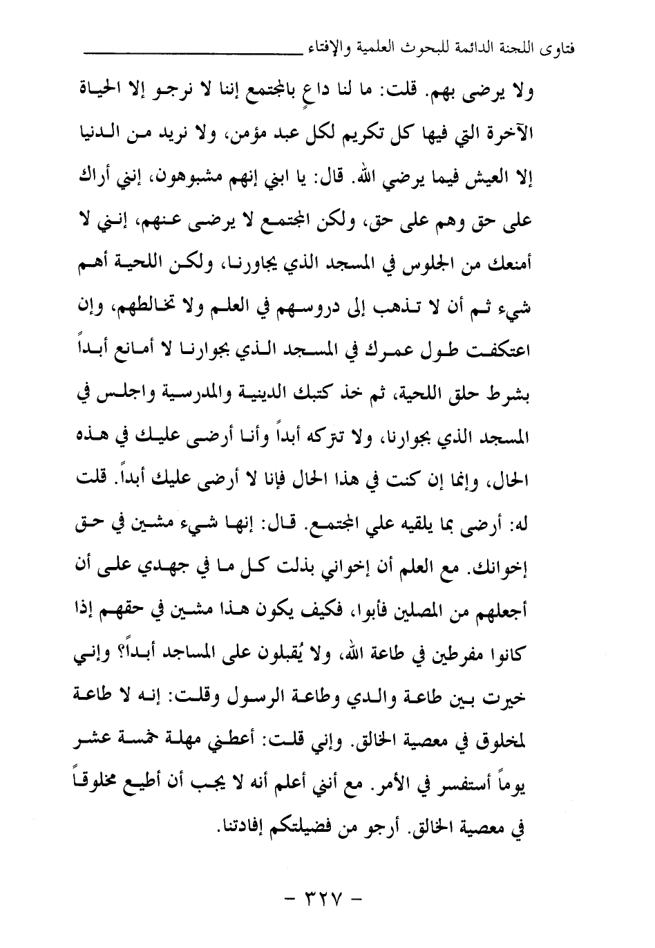 ولا يرضى بهم. قلت: ما لنا داع بالمجتمع إننا لا نرجو إلا الحياة الآخرة التي فيها كل تكريم لكل عبد مؤمن، ولا نريد من الدنيا إلا العيش فيما يرضي الله. قال: يا ابني إنهم مشبوهون، إنني أراك على حق وهم على حق، ولكن المجتمع لا يرضى عنهم، إنني لا أمنعك من الجلوس في المسجد الذي يجاورنا، ولكن اللحية أهم شيء ثم أن لا تذهب إلى دروسهم في العلم ولا تخالطهم، وإن اعتكفت طول عمرك في المسجد الذي بجوارنا لا أمانع أبدا بشرط حلق اللحية، ثم خذ كتبك الدينية والمدرسية واجلس في المسجد الذي بجوارنا، ولا تتركه أبدا وأنا أرضى عليك في هذه الحال، وإنما إن كنت في هذا الحال فأنا لا أرضى عليك أبدا. قلت له: أرضى بما يلقيه علي المجتمع. قال: إنها شيء مشين في حق إخوانك. مع العلم أن إخواني بذلت كل ما في جهدي على أن أجعلهم من المصلين فأبوا، فكيف يكون هذا مشين في حقهم إذا كانوا مفرطين في طاعة الله، ولا يقبلون على المساجد أبدا؟ وإني خيرت بين طاعة والدي وطاعة الرسول وقلت: إنه لا طاعة لمخلوق في معصية الخالق. وإني قلت: أعطني مهلة خمسة عشر يوما أستفسر في الأمر. مع أنني أعلم أنه لا يجب أن أطيع مخلوقا في معصية الخالق. أرجو من فضيلتكم إفادتنا.