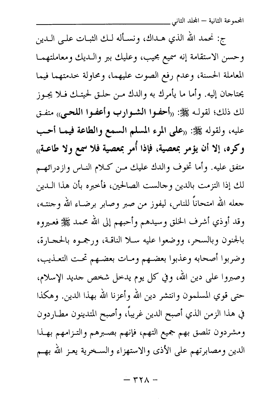 ج: نحمد الله الذي هداك، ونسأله لك الثبات على الدين وحسن الاستقامة إنه سميع مجيب، وعليك بر والديك ومعاملتهما المعاملة الحسنة، وعدم رفع الصوت عليهما، ومحاولة خدمتهما فيما يحتاجان إليه. وأما ما يأمرك به والدك من حلق لحيتك فلا يجوز لك ذلك؛ لقوله صلى الله عليه وسلم: «أحفوا الشوارب وأعفوا اللحى (¬1) » متفق عليه، ولقوله صلى الله عليه وسلم: «على المرء المسلم السمع والطاعة فيما أحب وكره، إلا أن يؤمر بمعصية، وإذا أمر بمعصية فلا سمع ولا طاعة (¬2) » متفق عليه. وأما تخوف والدك عليك من كلام الناس وازدرائهم لك إذا التزمت بالدين وجالست الصالحين، فأخبره بأن هذا الدين جعله الله امتحانا للناس، ليفوز من صبر وصابر برضاء الله وجنته، وقد أوذي أشرف الخلق وسيدهم وأحبهم إلى الله محمد صلى الله عليه وسلم فعيروه بالجنون وبالسحر، ووضعوا عليه سلا الناقة، ورجموه بالحجارة، وضربوا أصحابه وعذبوا بعضهم ومات بعضهم تحت التعذيب، وصبروا على دين الله، وفي كل يوم يدخل شخص جديد الإسلام، حتى قوي المسلمون وانتشر دين الله وأعزنا الله بهذا الدين. وهكذا في هذا الزمن الذي أصبح الدين غريبا، وأصبح المتدينون مطاردين ومشردين تلصق بهم جميع التهم، فإنهم بصبرهم والتزامهم بهذا الدين ومصابرتهم على الأذى والاستهزاء والسخرية يعز الله بهم