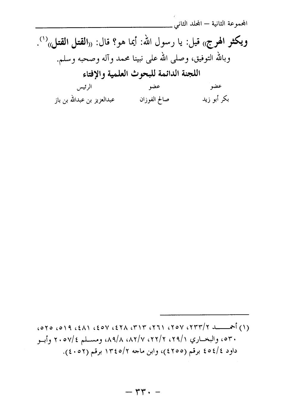 ويكثر الهرج قيل: يا رسول الله: أيما هو؟ قال: القتل القتل (¬1) » وبالله التوفيق، وصلى الله على نبينا محمد وآله وصحبه وسلم.