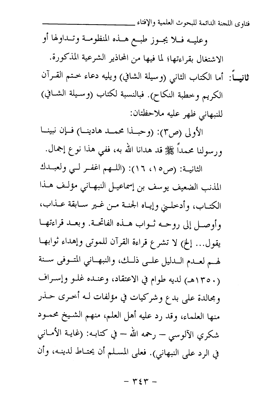 الثانية: (ص 15، 16) : (اللهم اغفر لي ولعبدك المذنب الضعيف يوسف بن إسماعيل النبهاني مؤلف هذا الكتاب، وأدخلني وإياه الجنة من غير سابقة عذاب، وأوصل إلى روحه ثواب هذه الفاتحة. وبعد قراءتها يقول.. . إلخ) لا تشرع قراءة القرآن للموتى وإهداء ثوابها لهم لعدم الدليل على ذلك، والنبهاني المتوفى سنة (1350 هـ) لديه طوام في الاعتقاد، وعنده غلو وإسراف ومجالدة على بدع وشركيات في مؤلفات له أخرى حذر منها العلماء، وقد رد عليه أهل العلم، منهم الشيخ محمود شكري الآلوسي - رحمه الله - في كتابه: (غاية الأماني في الرد على النبهاني) . فعلى المسلم أن يحتاط لدينه، وأن