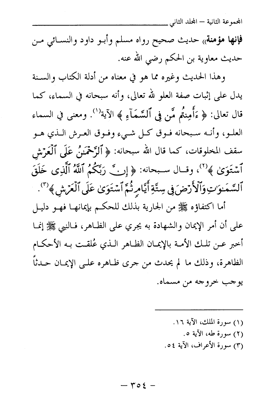 وهذا الحديث وغيره مما هو في معناه من أدلة الكتاب والسنة يدل على إثبات صفة العلو لله تعالى، وأنه سبحانه في السماء، كما قال تعالى: {أَأَمِنْتُمْ مَنْ فِي السَّمَاءِ} (¬2) الآية. ومعنى في السماء العلو، وأنه سبحانه فوق كل شيء وفوق العرش الذي هو سقف المخلوقات، كما قال الله سبحانه: {الرَّحْمَنُ عَلَى الْعَرْشِ اسْتَوَى} (¬3) ، وقال سبحانه: {إِنَّ رَبَّكُمُ اللَّهُ الَّذِي خَلَقَ السَّمَاوَاتِ وَالْأَرْضَ فِي سِتَّةِ أَيَّامٍ ثُمَّ اسْتَوَى عَلَى الْعَرْشِ} (¬4) .