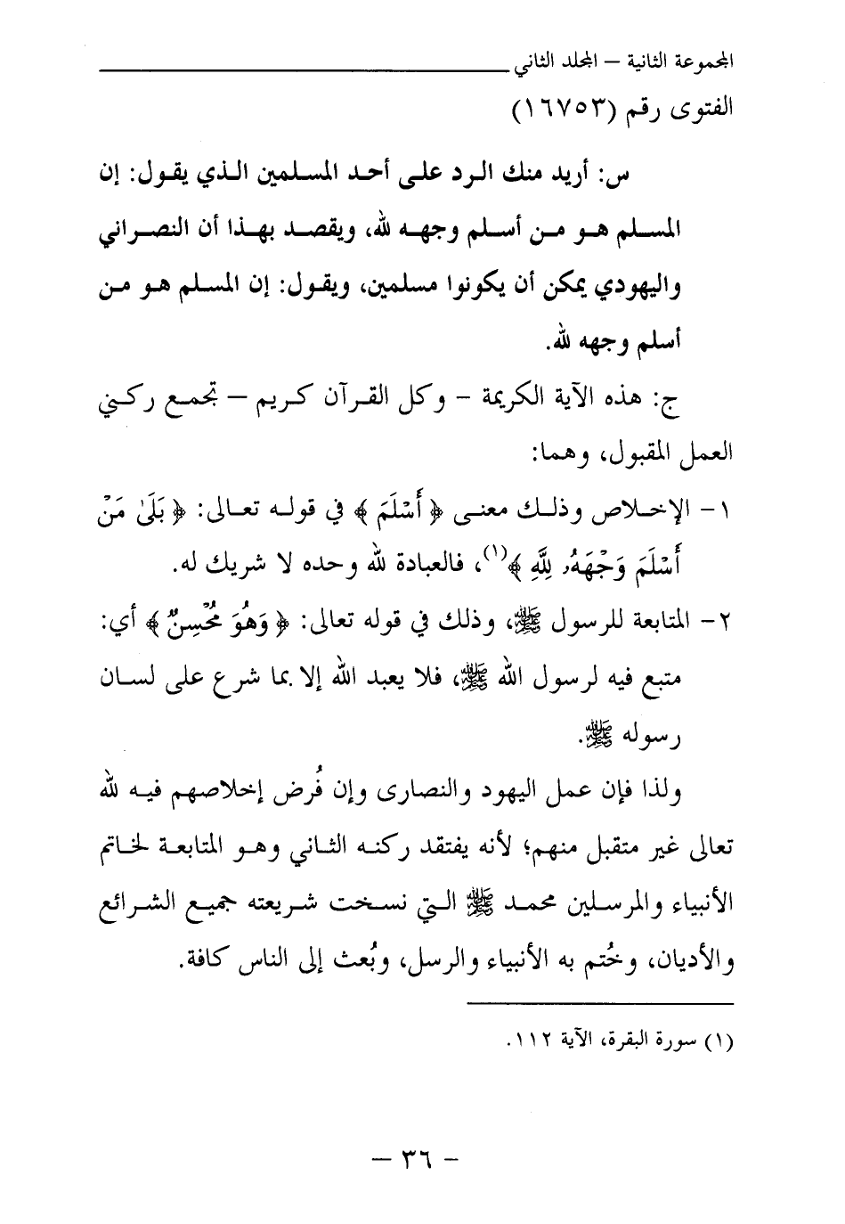 ولذا فإن عمل اليهود والنصارى وإن فرض إخلاصهم فيه لله تعالى غير متقبل منهم؛ لأنه يفتقد ركنه الثاني وهو المتابعة لخاتم الأنبياء والمرسلين محمد صلى الله عليه وسلم التي نسخت شريعته جميع الشرائع والأديان، وختم به الأنبياء والرسل، وبعث إلى الناس كافة.