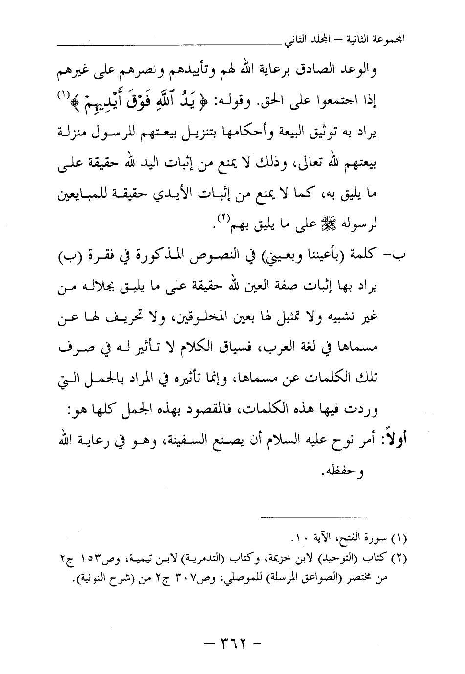 والوعد الصادق برعاية الله لهم وتأييدهم ونصرهم على غيرهم إذا اجتمعوا على الحق. وقوله: {يَدُ اللَّهِ فَوْقَ أَيْدِيهِمْ} (¬1) يراد به توثيق البيعة وأحكامها بتنزيل بيعتهم للرسول منزلة بيعتهم لله تعالى، وذلك لا يمنع من إثبات اليد لله حقيقة على ما يليق به، كما لا يمنع من إثبات الأيدي حقيقة للمبايعين لرسوله صلى الله عليه وسلم على ما يليق بهم.