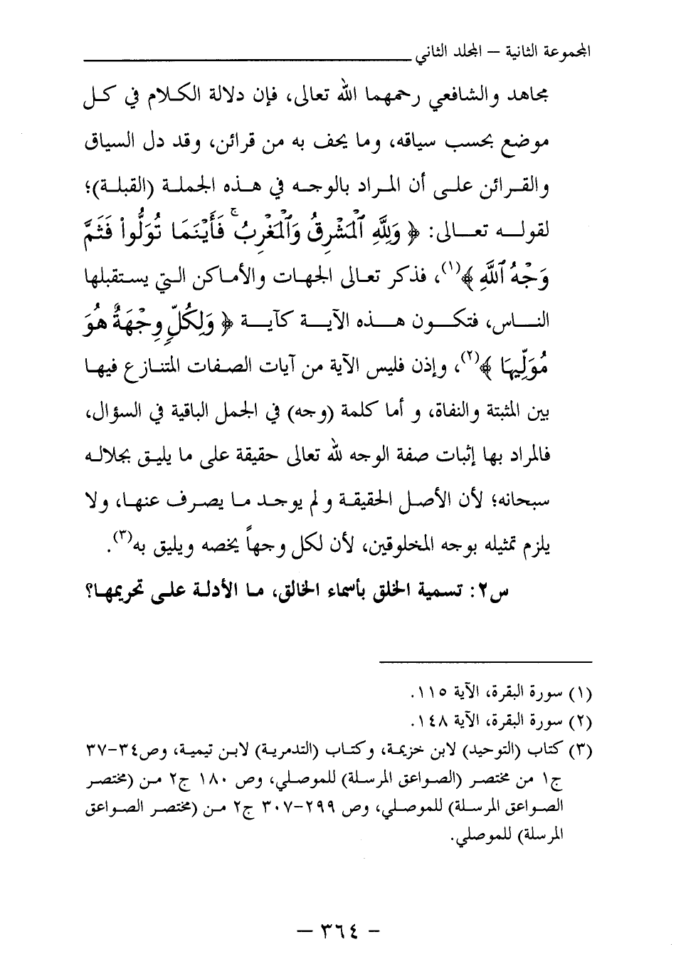 مجاهد والشافعي رحمهما الله تعالى، فإن دلالة الكلام في كل موضع بحسب سياقه، وما يحف به من قرائن، وقد دل السياق والقرائن على أن المراد بالوجه في هذه الجملة (القبلة) ؛ لقوله تعالى: {وَلِلَّهِ الْمَشْرِقُ وَالْمَغْرِبُ فَأَيْنَمَا تُوَلُّوا فَثَمَّ وَجْهُ اللَّهِ} (¬1) ، فذكر تعالى الجهات والأماكن التي يستقبلها الناس، فتكون هذه الآية كآية {وَلِكُلٍّ وِجْهَةٌ هُوَ مُوَلِّيهَا} (¬2) ، وإذن فليس الآية من آيات الصفات المتنازع فيها بين المثبتة والنفاة، وأما كلمة (وجه) في الجمل الباقية في السؤال، فالمراد بها إثبات صفة الوجه لله تعالى حقيقة على ما يليق بجلاله سبحانه؛ لأن الأصل الحقيقة ولم يوجد ما يصرف عنها، ولا يلزم تمثيله بوجه المخلوقين، لأن لكل وجها يخصه ويليق به.