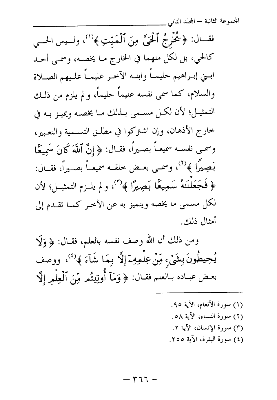 فقال: {يُخْرِجُ الْحَيَّ مِنَ الْمَيِّتِ} (¬1) ، وليس الحي كالحي، بل لكل منهما في الخارج ما يخصه، وسمى أحد ابني إبراهيم حليما وابنه الآخر عليما عليهم الصلاة والسلام، كما سمى نفسه عليما حليما، ولم يلزم من ذلك التمثيل؛ لأن لكل مسمى بذلك ما يخصه ويميز به في خارج الأذهان، وإن اشتركوا في مطلق التسمية والتعبير، وسمى نفسه سميعا بصيرا، فقال: {إِنَّ اللَّهَ كَانَ سَمِيعًا بَصِيرًا} (¬2) ، وسمى بعض خلقه سميعا بصيرا، فقال: {فَجَعَلْنَاهُ سَمِيعًا بَصِيرًا} (¬3) ، ولم يلزم التمثيل؛ لأن لكل مسمى ما يخصه ويتميز به عن الآخر كما تقدم إلى أمثال ذلك.