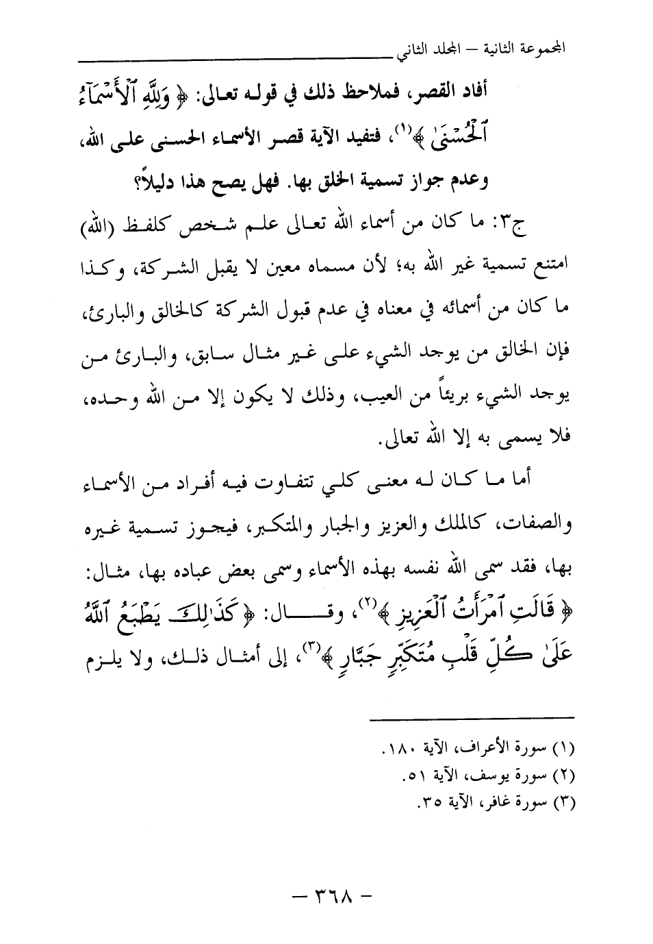 أما ما كان له معنى كلي تتفاوت فيه أفراد من الأسماء والصفات، كالملك والعزيز والجبار والمتكبر، فيجوز تسمية غيره بها، فقد سمى الله نفسه بهذه الأسماء وسمى بعض عباده بها، مثال: {قَالَتِ امْرَأَةُ الْعَزِيزِ} (¬2) ، وقال: {كَذَلِكَ يَطْبَعُ اللَّهُ عَلَى كُلِّ قَلْبِ مُتَكَبِّرٍ جَبَّارٍ} (¬3) ، إلى أمثال ذلك، ولا يلزم