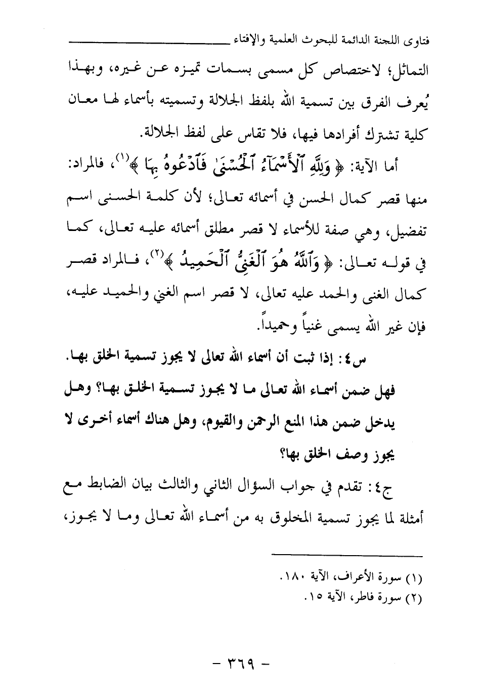 قصر كمال الحسن في أسمائه تعالى؛ لأن كلمة الحسنى اسم تفضيل، وهي صفة للأسماء لا قصر مطلق أسمائه عليه تعالى، كما في قوله تعالى: {وَاللَّهُ هُوَ الْغَنِيُّ الْحَمِيدُ} (¬2) ، فالمراد قصر كمال الغنى والحمد عليه تعالى، لا قصر اسم الغني والحميد عليه، فإن غير الله يسمى غنيا وحميدا.