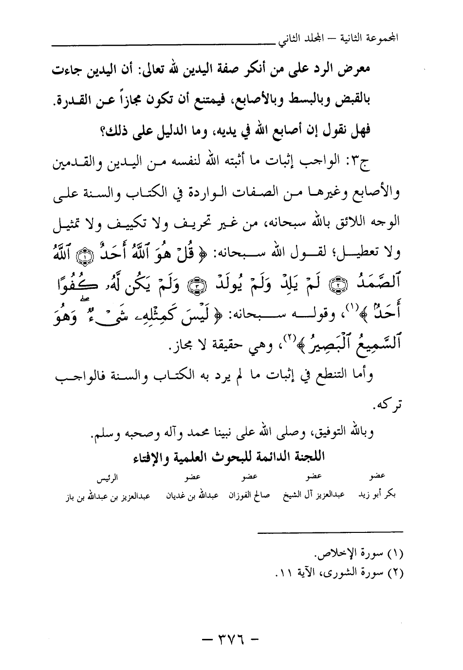 ج 3: الواجب إثبات ما أثبته الله لنفسه من اليدين والقدمين والأصابع وغيرها من الصفات الواردة في الكتاب والسنة على الوجه اللائق بالله سبحانه، من غير تحريف ولا تكييف ولا تمثيل ولا تعطيل؛ لقول الله سبحانه: {قُلْ هُوَ اللَّهُ أَحَدٌ} (¬1) {اللَّهُ الصَّمَدُ} (¬2) {لَمْ يَلِدْ وَلَمْ يُولَدْ} (¬3) {وَلَمْ يَكُنْ لَهُ كُفُوًا أَحَدٌ} (¬4) ، وقوله سبحانه: {لَيْسَ كَمِثْلِهِ شَيْءٌ وَهُوَ السَّمِيعُ الْبَصِيرُ} (¬5) ، وهي حقيقة لا مجاز.