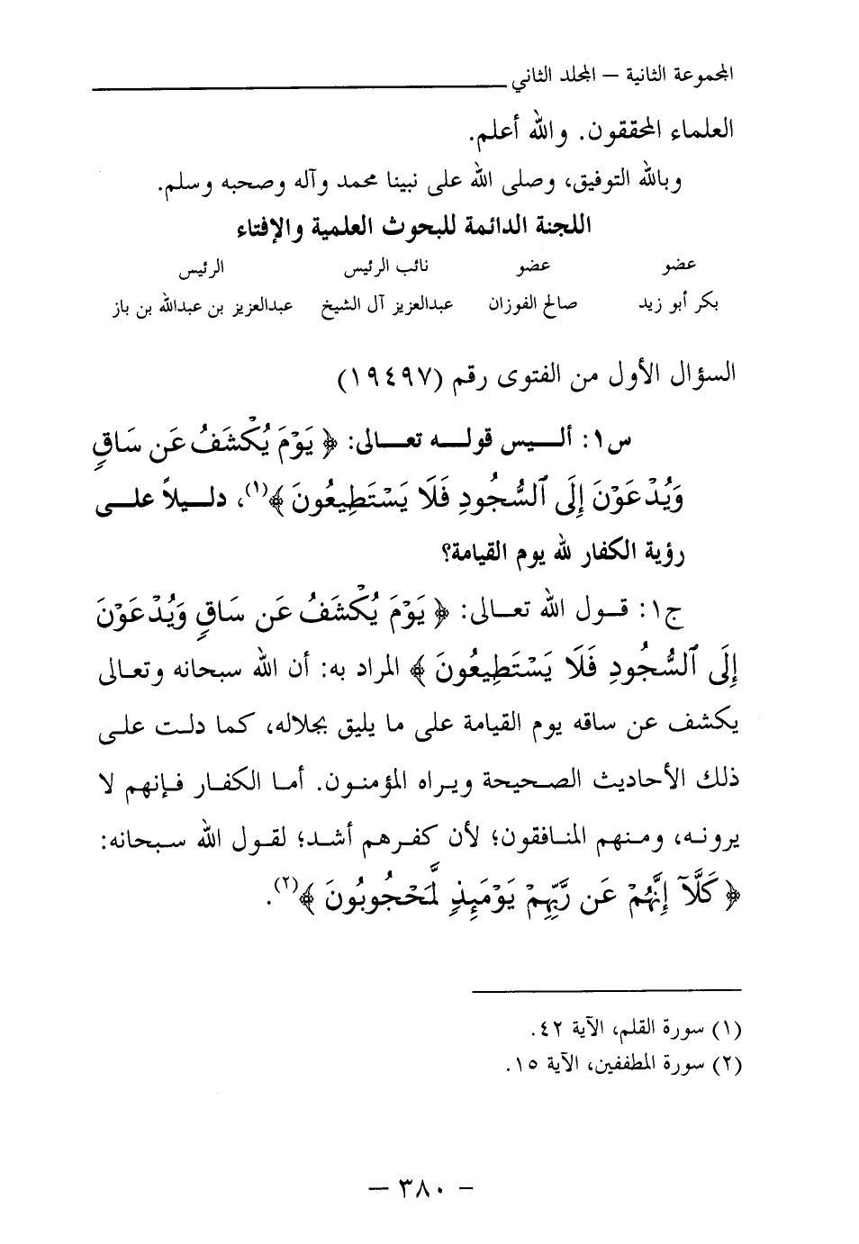 ج 1: قول الله تعالى: {يَوْمَ يُكْشَفُ عَنْ سَاقٍ وَيُدْعَوْنَ إِلَى السُّجُودِ فَلَا يَسْتَطِيعُونَ} (¬2) المراد به: أن الله سبحانه وتعالى يكشف عن ساقه يوم القيامة على ما يليق بجلاله، كما دلت على ذلك الأحاديث الصحيحة ويراه المؤمنون. أما الكفار فإنهم لا يرونه، ومنهم المنافقون؛ لأن كفرهم أشد؛ لقول الله سبحانه: {كَلَّا إِنَّهُمْ عَنْ رَبِّهِمْ يَوْمَئِذٍ لَمَحْجُوبُونَ} (¬3) .