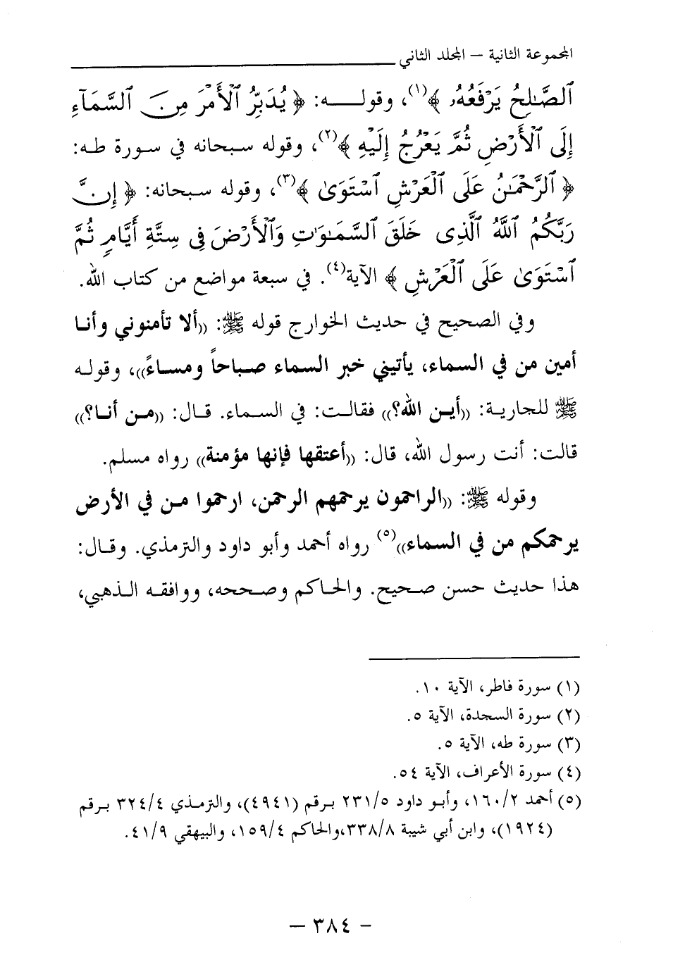 وفي الصحيح في حديث الخوارج قوله صلى الله عليه وسلم: «ألا تأمنوني وأنا أمين من في السماء، يأتيني خبر السماء صباحا ومساء (¬4) » ، «وقوله صلى الله عليه وسلم للجارية: "أين الله؟ " فقالت: في السماء. قال: "من أنا؟ " قالت: أنت رسول الله، قال: "أعتقها فإنها مؤمنة (¬5) » رواه مسلم.