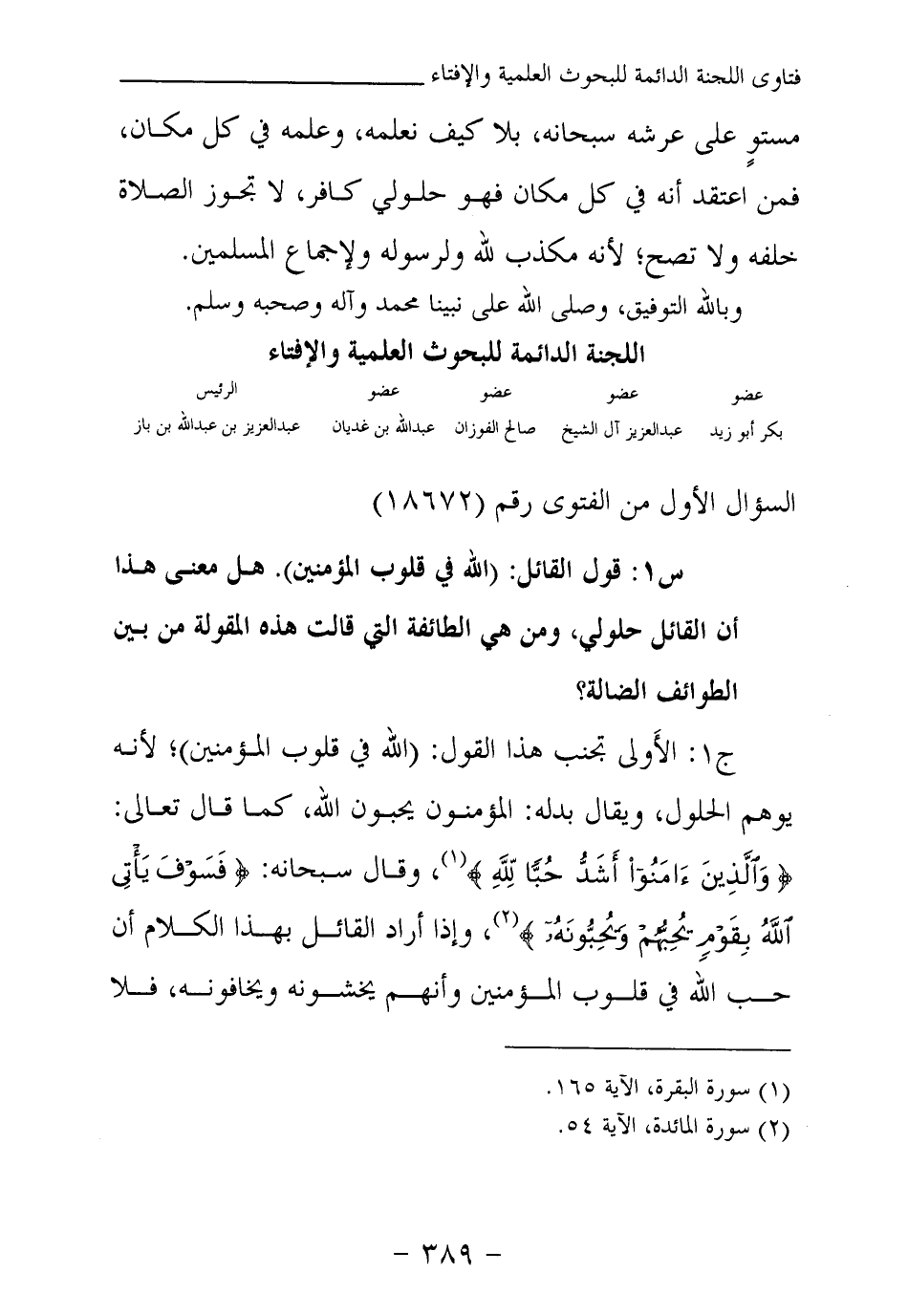 ج 1: الأولى تجنب هذا القول: (الله في قلوب المؤمنين) ، لأنه يوهم الحلول، ويقال بدله: المؤمنون يحبون الله، كما قال تعالى: {وَالَّذِينَ آمَنُوا أَشَدُّ حُبًّا لِلَّهِ} (¬1) ، وقال سبحانه: {فَسَوْفَ يَأْتِي اللَّهُ بِقَوْمٍ يُحِبُّهُمْ وَيُحِبُّونَهُ} (¬2) ، وإذا أراد القائل بهذا الكلام أن حب الله في قلوب المؤمنين وأنهم يخشونه ويخافونه، فلا