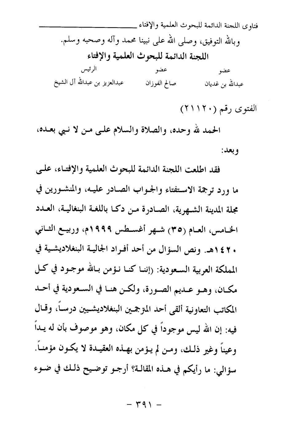 فقد اطلعت اللجنة الدائمة للبحوث العلمية والإفتاء، على ما ورد ترجمة الاستفتاء والجواب الصادر عليه، والمنشورين في مجلة المدينة الشهرية، الصادرة من دكا باللغة البنغالية، العدد الخامس، العام (35) شهر أغسطس 1999 م، وربيع الثاني 1420 هـ. ونص السؤال من أحد أفراد الجالية البنغلاديشية في المملكة العربية السعودية: (إننا كنا نؤمن بالله موجود في كل مكان، وهو عديم الصورة، ولكن هنا في السعودية في أحد المكاتب التعاونية ألقى أحد المترجمين البنغلاديشيين درسا، وقال فيه: إن الله ليس موجودا في كل مكان، وهو موصوف بأن له يدا وعينا وغير ذلك، ومن لم يؤمن بهذه العقيدة لا يكون مؤمنا. سؤالي: ما رأيكم في هذه المقالة؟ أرجو توضيح ذلك في ضوء