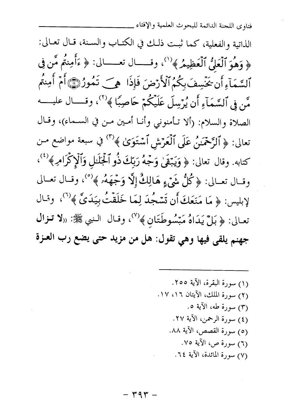 الذاتية والفعلية، كما ثبت ذلك في الكتاب والسنة، قال تعالى: {وَهُوَ الْعَلِيُّ الْعَظِيمُ} (¬1) ، وقال تعالى: {أَأَمِنْتُمْ مَنْ فِي السَّمَاءِ أَنْ يَخْسِفَ بِكُمُ الْأَرْضَ فَإِذَا هِيَ تَمُورُ} (¬2) {أَمْ أَمِنْتُمْ مَنْ فِي السَّمَاءِ أَنْ يُرْسِلَ عَلَيْكُمْ حَاصِبًا} (¬3) ، وقال عليه الصلاة والسلام: «ألا تأمنوني وأنا أمين من في السماء (¬4) » ، وقال تعالى: {الرَّحْمَنُ عَلَى الْعَرْشِ اسْتَوَى} (¬5) في سبعة مواضع من كتابه. وقال تعالى: {وَيَبْقَى وَجْهُ رَبِّكَ ذُو الْجَلَالِ وَالْإِكْرَامِ} (¬6) ، وقال تعالى: {كُلُّ شَيْءٍ هَالِكٌ إِلَّا وَجْهَهُ} (¬7) ، وقال تعالى لإبليس: {مَا مَنَعَكَ أَنْ تَسْجُدَ لِمَا خَلَقْتُ بِيَدَيَّ} (¬8) ، وقال تعالى: {بَلْ يَدَاهُ مَبْسُوطَتَانِ} (¬9) ، وقال النبي صلى الله عليه وسلم: «لا تزال جهنم يلقى فيها وهي تقول: هل من مزيد، حتى يضع رب العزة