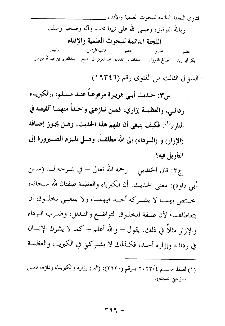 س 3: حديث أبي هريرة مرفوعا عند مسلم: «الكبرياء ردائي، والعظمة إزاري، فمن نازعني واحدا منهما ألقيته في النار (¬1) » . فكيف ينبغبي أن نفهم هذا الحديث، وهل يجوز إضافة (الإزار) و (الرداء) إلى الله مطلقا، وهل يلزم الصيرورة إلى التأويل فيه؟