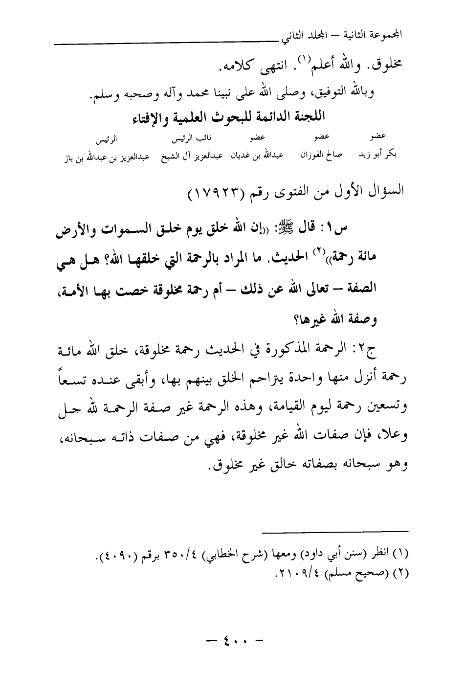 س 1: قال صلى الله عليه وسلم: «إن الله خلق يوم خلق السماوات والأرض مائة رحمة (¬1) » الحديث. ما المراد بالرحمة التي خلقها الله؟ هل هي الصفة- تعالى الله عن ذلك- أم رحمة مخلوقة خصت بها الأمة، وصفة الله غيرها؟