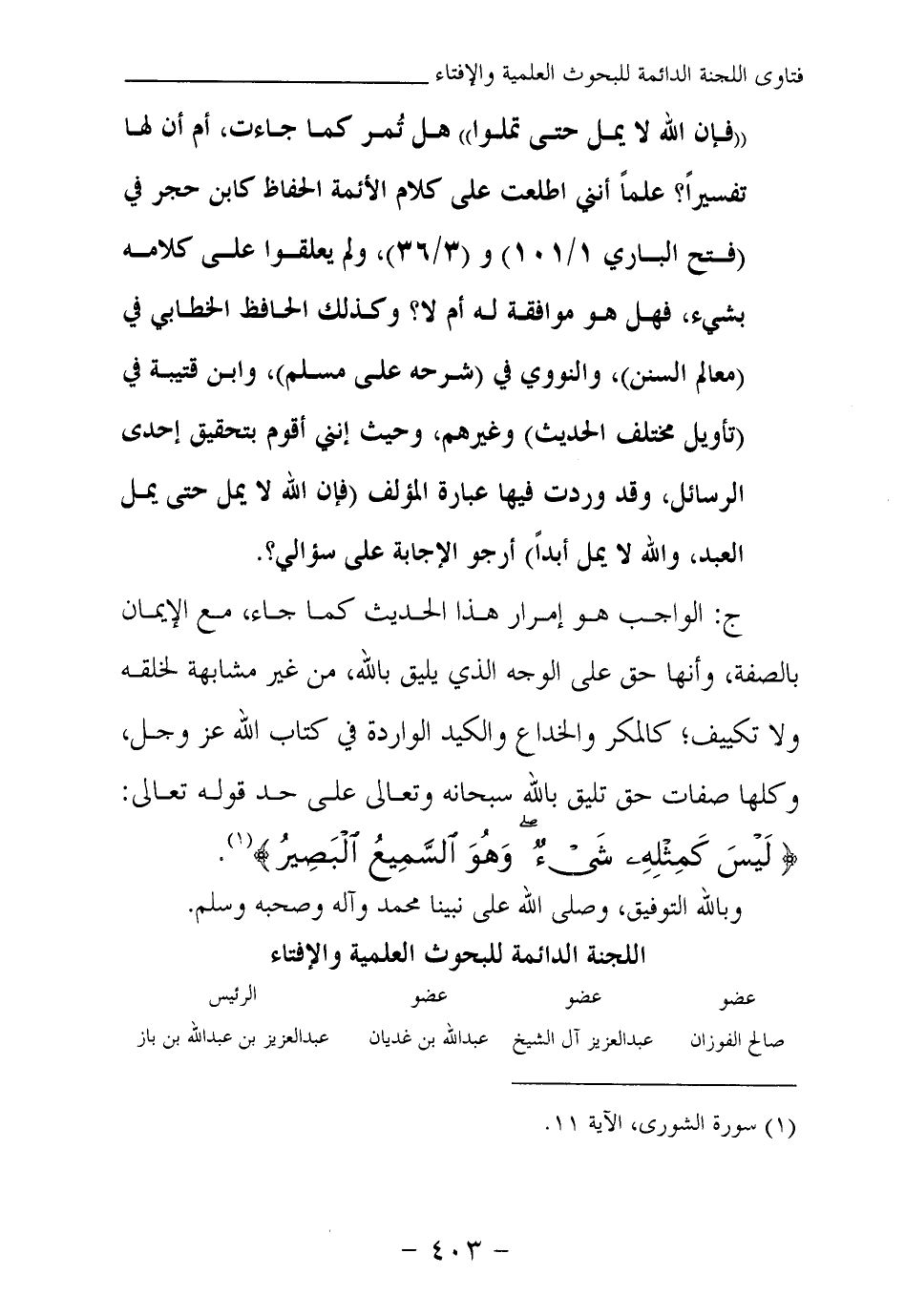 ج: الواجب هو إمرار هذا الحديث كما جاء، مع الإيمان بالصفة، وأنها حق على الوجه الذي يليق بالله، من غير مشابهة لخلقه ولا تكييف، كالمكر والخداع والكيد الواردة في كتاب الله عز وجل، وكلها صفات حق تليق بالله سبحانه وتعالى على حد قوله تعالى: {لَيْسَ كَمِثْلِهِ شَيْءٌ وَهُوَ السَّمِيعُ الْبَصِيرُ} (¬2) .
