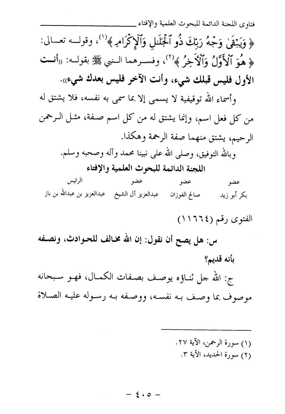 {وَيَبْقَى وَجْهُ رَبِّكَ ذُو الْجَلَالِ وَالْإِكْرَامِ} (¬1) ، وقوله تعالى: {هُوَ الْأَوَّلُ وَالْآخِرُ} (¬2) ، وفسرهما النبي صلى الله عليه وسلم بقوله: «أنت الأول فليس قبلك شيء، وأنت الآخر فليس بعدك شيء (¬3) » .