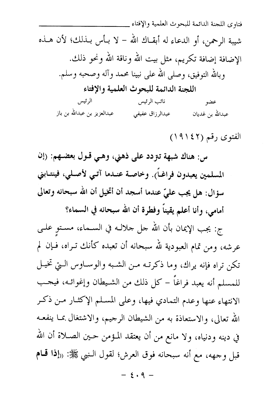 ج: يجب الإيمان بأن الله جل جلاله في السماء، مستو على عرشه، ومن تمام العبودية لله سبحانه أن تعبده كأنك تراه، فإن لم تكن تراه فإنه يراك، وما ذكرته من الشبه والوساوس التي تخيل للمسلم أنه يعبد فراغا- كل ذلك من الشيطان وإغوائه، فيجب الانتهاء عنها وعدم التمادي فيها، وعلى المسلم الإكثار من ذكر الله تعالى، والاستعاذة به من الشيطان الرجيم، والاشتغال بما ينفعه في دينه ودنياه، ولا مانع من أن يعتقد المؤمن حين الصلاة أن الله قبل وجهه، مع أنه سبحانه فوق العرش؛ لقول النبي صلى الله عليه وسلم: «إذا قام