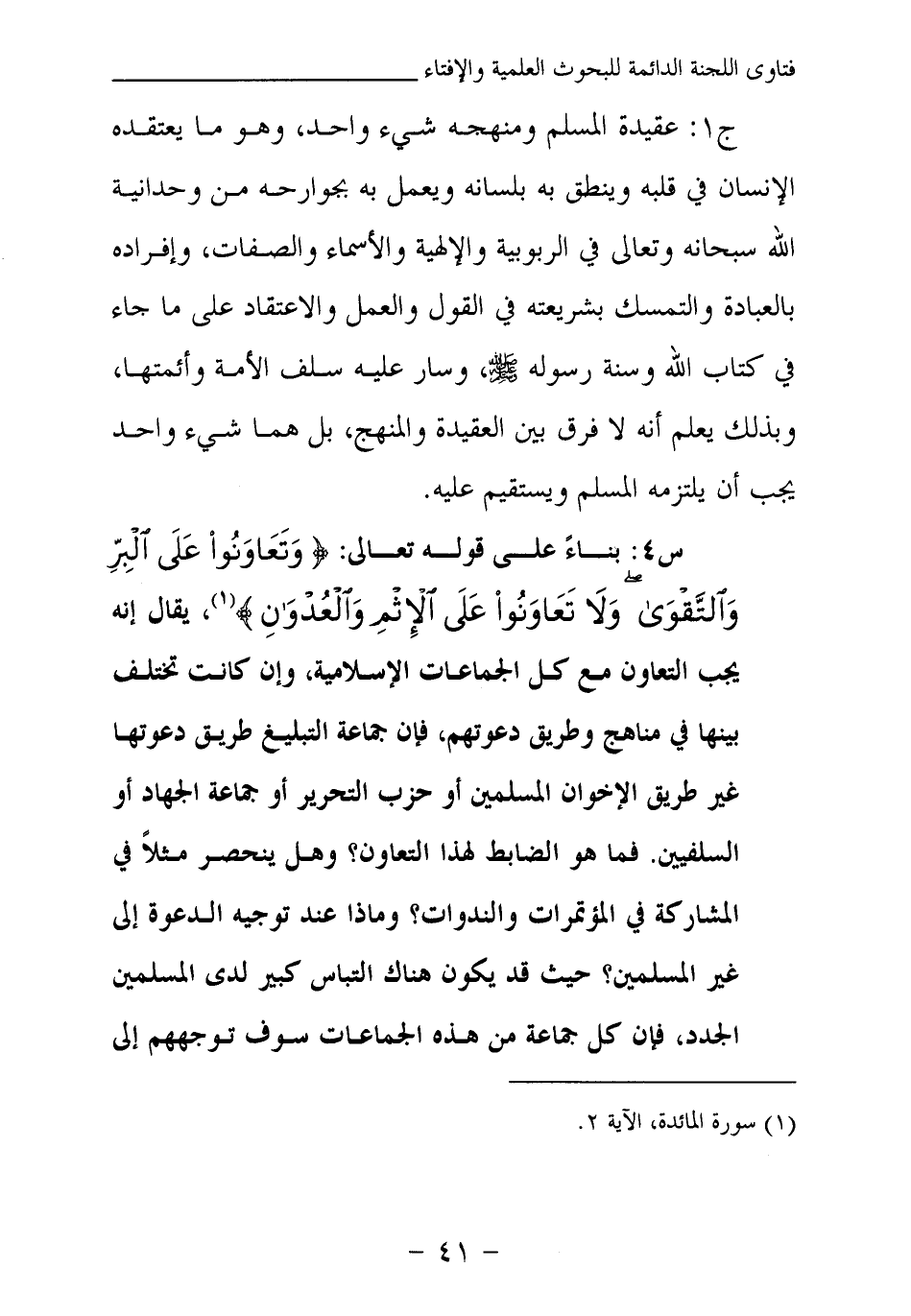 س 4: بناء على قوله تعالى: {وَتَعَاوَنُوا عَلَى الْبِرِّ وَالتَّقْوَى وَلَا تَعَاوَنُوا عَلَى الْإِثْمِ وَالْعُدْوَانِ} (¬1) ، يقال إنه يجب التعاون مع كل الجماعات الإسلامية، وإن كانت تختلف بينها في مناهج وطريق دعوتهم، فإن جماعة التبليغ طريق دعوتها غير طريق الإخوان المسلمين أو حزب التحرير أو جماعة الجهاد أو السلفيين. فما هو الضابط لهذا التعاون؟ وهل ينحصر مثلا في المشاركة في المؤتمرات والندوات؟ وماذا عند توجيه الدعوة إلى غير المسلمين؟ حيث قد يكون هناك التباس كبير لدى المسلمين الجدد، فإن كل جماعة من هذه الجماعات سوف توجههم إلى