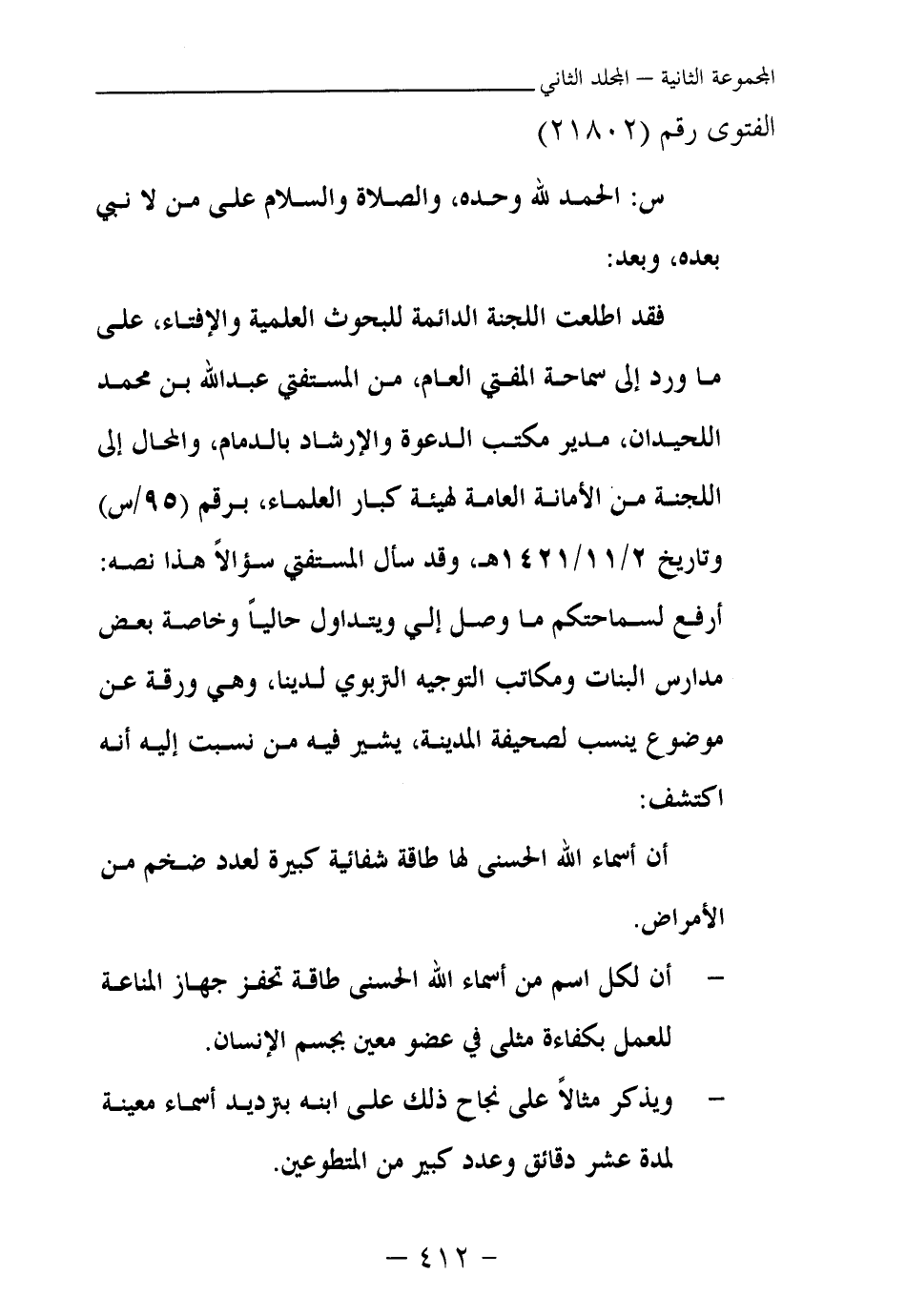 فقد اطلعت اللجنة الدائمة للبحوث العلمية والإفتاء، على ما ورد إلى سماحة المفتي العام، من المستفتي عبد الله بن محمد اللحيدان، مدير مكتب الدعوة والإرشاد بالدمام، والمحال إلى اللجنة من الأمانة العامة لهيئة كبار العلماء، برقم (95\ س) وتاريخ 2\ 11\ 1421 هـ وقد سأل المستفتي سؤالا هذا نصه: أرفع لسماحتكم ما وصل إلي ويتداول حاليا وخاصة بعض مدارس البنات ومكاتب التوجيه التربوي لدينا، وهي ورقة عن موضوع ينسب لصحيفة المدينة، يشير فيه من نسبت إليه أنه اكتشف: