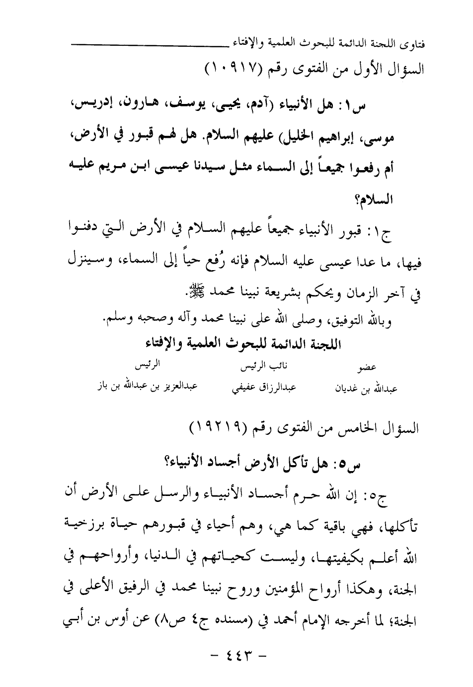 ج 5: إن الله حرم أجساد الأنبياء والرسل على الأرض أن تأكلها، فهي باقية كما هي، وهم أحياء في قبورهم حياة برزخية الله أعلم بكيفيتها، وليست كحياتهم في الدنيا، وأرواحهم في الجنة، وهكذا أرواح المؤمنين وروح نبينا محمد في الرفيق الأعلى في الجنة، لما أخرجه الإمام أحمد في (مسنده ج4 ص 8) عن أوس بن أبي