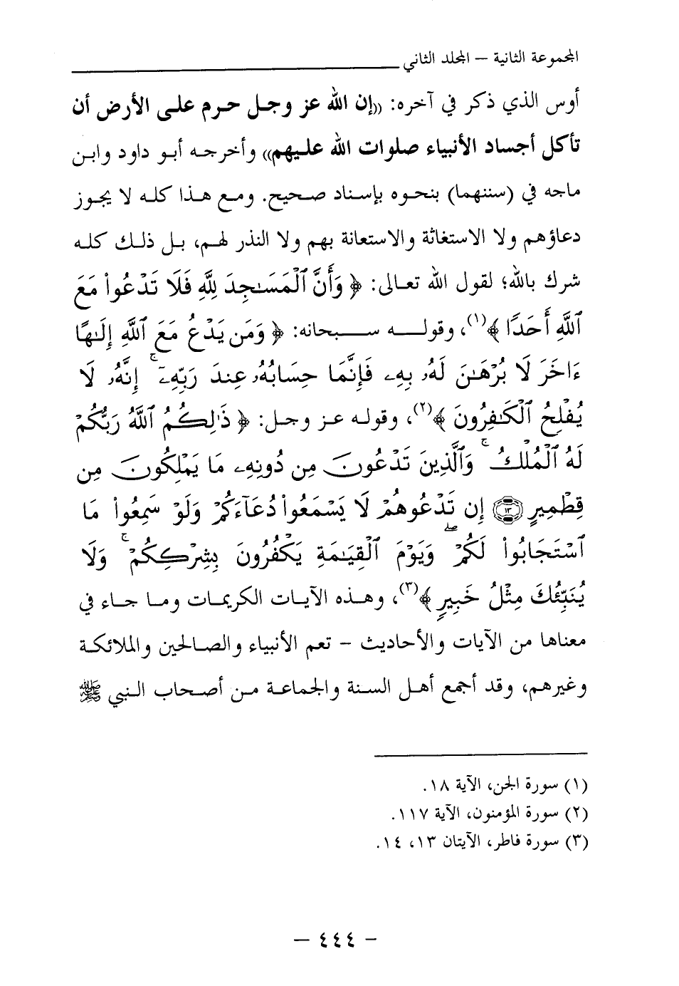 أوس، الذي ذكر في آخره: «إن الله عز وجل حرم على الأرض أن تأكل أجساد الأنبياء صلوات الله عليهم (¬1) » وأخرجه أبو داود وابن ماجه في (سننهما) بنحوه بإسناد صحيح. ومع هذا كله لا يجوز دعاؤهم ولا الاستغاثة والاستعانة بهم ولا النذر لهم، بل ذلك كله شرك بالله؛ لقول الله تعالى: {وَأَنَّ الْمَسَاجِدَ لِلَّهِ فَلَا تَدْعُوا مَعَ اللَّهِ أَحَدًا} (¬2) ، وقوله سبحانه: {وَمَنْ يَدْعُ مَعَ اللَّهِ إِلَهًا آخَرَ لَا بُرْهَانَ لَهُ بِهِ فَإِنَّمَا حِسَابُهُ عِنْدَ رَبِّهِ إِنَّهُ لَا يُفْلِحُ الْكَافِرُونَ} (¬3) ، وقوله عز وجل: {ذَلِكُمُ اللَّهُ رَبُّكُمْ لَهُ الْمُلْكُ وَالَّذِينَ تَدْعُونَ مِنْ دُونِهِ مَا يَمْلِكُونَ مِنْ قِطْمِيرٍ} (¬4) {إِنْ تَدْعُوهُمْ لَا يَسْمَعُوا دُعَاءَكُمْ وَلَوْ سَمِعُوا مَا اسْتَجَابُوا لَكُمْ وَيَوْمَ الْقِيَامَةِ يَكْفُرُونَ بِشِرْكِكُمْ وَلَا يُنَبِّئُكَ مِثْلُ خَبِيرٍ} (¬5) ، وهذه الآيات الكريمات وما جاء في معناها من الآيات والأحاديث- تعم الأنبياء والصالحين والملائكة وغيرهم، وقد أجمع أهل السنة والجماعة من أصحاب النبي صلى الله عليه وسلم
