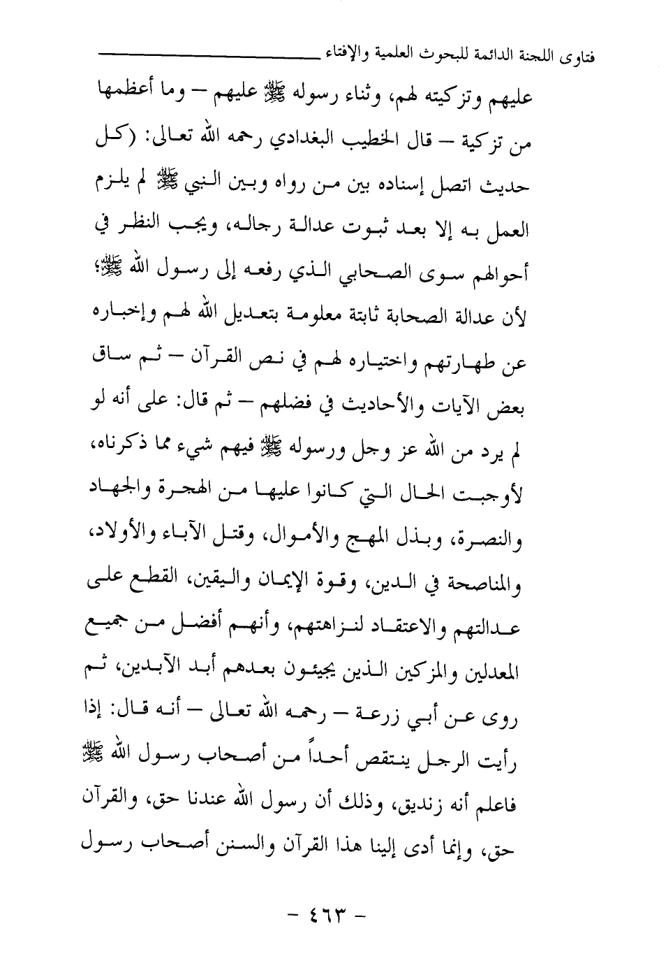 عليهم وتزكيته لهم، وثناء رسوله صلى الله عليه وسلم عليهم، وما أعظمها من تزكية- قال الخطيب البغدادي رحمه الله تعالى: (كل حديث اتصل إسناده بين من رواه وبين النبي صلى الله عليه وسلم لم يلزم العمل به إلا بعد ثبوت عدالة رجاله، ويجب النظر في أحوالهم سوى الصحابي الذي رفعه إلى رسول الله صلى الله عليه وسلم؛ لأن عدالة الصحابة ثابتة معلومة بتعديل الله لهم وإخباره عن طهارتهم واختياره لهم في نص القرآن- ثم ساق بعض الآيات والأحاديث في فضلهم- ثم قال: على أنه لو لم يرد من الله عز وجل ورسوله صلى الله عليه وسلم فيهم شيء مما ذكرناه، لأوجبت الحال التي كانوا عليها من الهجرة والجهاد والنصرة، وبذل المهج والأموال، وقتل الآباء والأولاد، والمناصحة في الدين، وقوة الإيمان واليقين، القطع على عدالتهم والاعتقاد لنزاهتهم، وأنهم أفضل من جميع المعدلين والمزكين الذين يجيئون بعدهم أبد الآبدين، تم روى عن أبي زرعة - رحمه الله تعالى- أنه قال: إذا رأيت الرجل ينتقص أحدا من أصحاب رسول الله صلى الله عليه وسلم فاعلم أنه زنديق، وذلك أن رسول الله عندنا حق، والقرآن حق، وإنما أدى إلينا هذا القرآن والسنن أصحاب رسول
