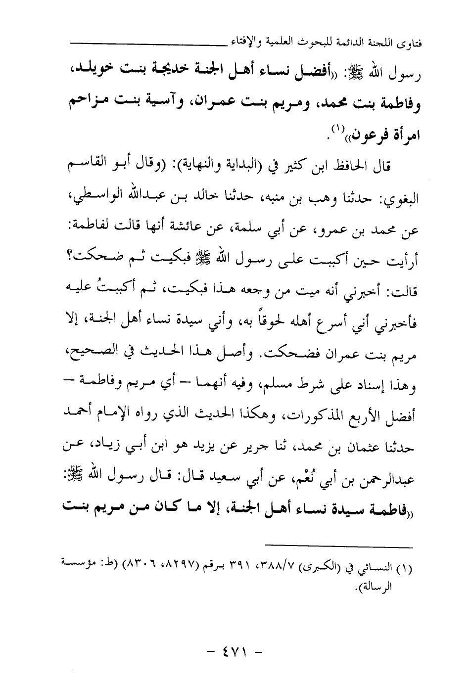 قال الحافظ ابن كثير في (البداية والنهاية) : (وقال أبو القاسم البغوي: حدثنا وهب بن منبه، حدثنا خالد بن عبد الله الواسطي، عن محمد بن عمرو، عن أبي سلمة، عن عائشة أنها قالت لفاطمة: أرأيت حين أكببت على رسول الله صلى الله عليه وسلم فبكيت ثم ضحكت؟ قالت: أخبرني أنه ميت من وجعه هذا فبكيت، ثم أكببت عليه فأخبرني أني أسرع أهله لحوقا به، وأني سيدة نساء أهل الجنة، إلا مريم بنت عمران فضحكت. وأصل هذا الحديث في الصحيح، وهذا إسناد على شرط مسلم، وفيه أنهما- أي مريم وفاطمة - أفضل الأربع المذكورات، وهكذا الحديث الذي رواه الإمام أحمد، حدثنا عثمان بن محمد، ثنا جرير عن يزيد هو ابن أبي زياد، عن عبد الرحمن بن أبي نعم، عن أبي سعيد قال: قال رسول الله صلى الله عليه وسلم: «فاطمة سيدة نساء أهل الجنة، إلا ما كان من مريم بنت