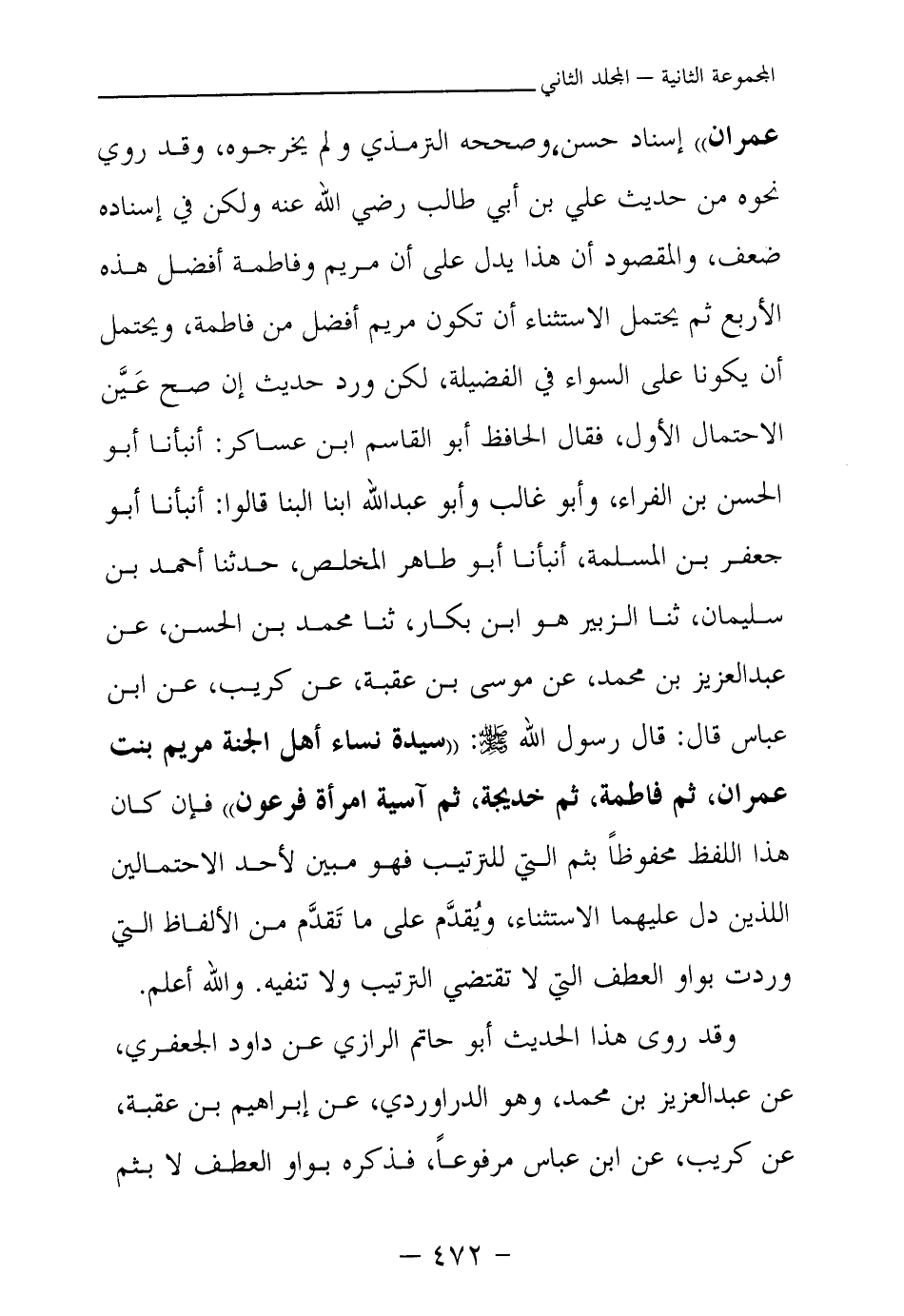 عمران (¬1) » إسناد حسن وصححه الترمذي ولم يخرجوه، وقد روي نحوه من حديث علي بن أبي طالب رضي الله عنه ولكن في إسناده ضعف، والمقصود أن هذا يدل على أن مريم وفاطمة أفضل هذه الأربع ثم يحتمل الاستثناء أن تكون مريم أفضل من فاطمة، ويحتمل أن يكونا على السواء في الفضيلة، لكن ورد حديث إن صح عين الاحتمال الأول، فقال الحافظ أبو القاسم ابن عساكر: أنبأنا أبو الحسن بن الفراء، وأبو غالب وأبو عبد الله ابنا البنا قالوا: أنبأنا أبو جعفر بن المسلمة، أنبأنا أبو طاهر المخلص، حدثنا أحمد بن سليمان، ثنا الزبير هو ابن بكار، ثنا محمد بن الحسن، عن عبد العزيز بن محمد، عن موسى بن عقبة، عن كريب، عن ابن عباس قال: قال رسول الله صلى الله عليه وسلم: «سيدة نساء أهل الجنة مريم بنت عمران، ثم فاطمة، ثم خديجة، ثم آسية امرأة فرعون» فإن كان هذا اللفظ محفوظا بثم التي للترتيب فهو مبين لأحد الاحتمالين اللذين دل عليهما الاستثناء، ويقدم على ما تقدم من الألفاظ التي وردت بواو العطف التي لا تقتضي الترتيب ولا تنفيه. والله أعلم.