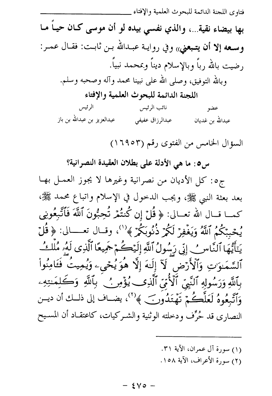 ج 5: كل الأديان من نصرانية وغيرها لا يجوز العمل بها بعد بعثة النبي صلى الله عليه وسلم، ويجب الدخول في الإسلام واتباع محمد صلى الله عليه وسلم، كما قال الله تعالى: {قُلْ إِنْ كُنْتُمْ تُحِبُّونَ اللَّهَ فَاتَّبِعُونِي يُحْبِبْكُمُ اللَّهُ وَيَغْفِرْ لَكُمْ ذُنُوبَكُمْ} (¬1) ، وقال تعالى: {قُلْ يَاأَيُّهَا النَّاسُ إِنِّي رَسُولُ اللَّهِ إِلَيْكُمْ جَمِيعًا الَّذِي لَهُ مُلْكُ السَّمَاوَاتِ وَالْأَرْضِ لَا إِلَهَ إِلَّا هُوَ يُحْيِي وَيُمِيتُ فَآمِنُوا بِاللَّهِ وَرَسُولِهِ النَّبِيِّ الْأُمِّيِّ الَّذِي يُؤْمِنُ بِاللَّهِ وَكَلِمَاتِهِ وَاتَّبِعُوهُ لَعَلَّكُمْ تَهْتَدُونَ} (¬2) يضاف إلى ذلك أن دين النصارى قد حرف ودخلته الوثنية والشركيات، كاعتقاد أن المسيح