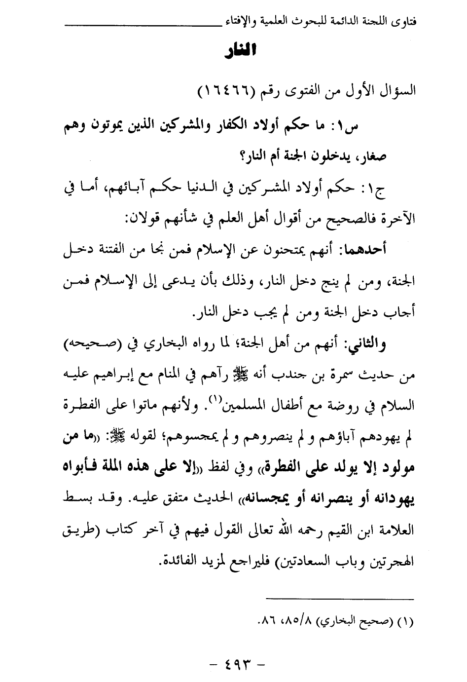 والثاني: أنهم من أهل الجنة؛ لما رواه البخاري في (صحيحه) من حديث سمرة بن جندب أنه صلى الله عليه وسلم رآهم في المنام مع إبراهيم عليه السلام في روضة مع أطفال المسلمين (¬1) ولأنهم ماتوا على الفطرة لم يهودهم آباؤهم ولم ينصروهم ولم يمجسوهم؛ لقوله صلى الله عليه وسلم: «ما من مولود إلا يولد على الفطرة" وفي لفظ "إلا على هذه الملة فأبواه يهودانه أو ينصرانه أو يمجسانه (¬2) » الحديث متفق عليه. وقد بسط العلامة ابن القيم رحمه الله تعالى القول فيهم في آخر كتاب (طريق الهجرتين وباب السعادتين) فليراجع لمزيد الفائدة.