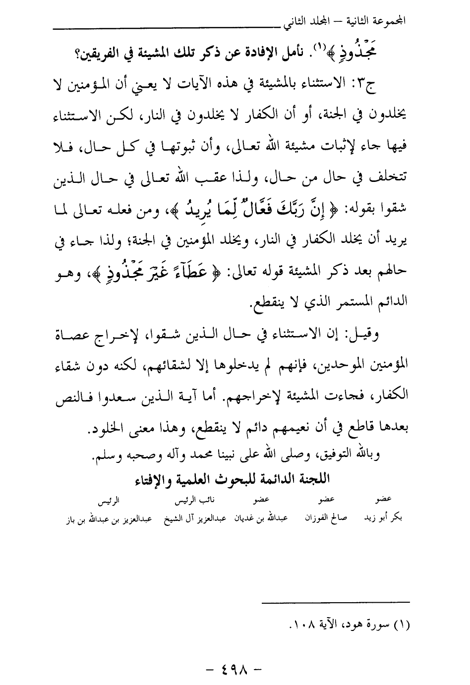 ج 3: الاستثناء بالمشيئة في هذه الآيات لا يعني أن المؤمنين لا يخلدون في الجنة، أو أن الكفار لا يخلدون في النار، لكن الاستثناء فيها جاء لإثبات مشيئة الله تعالى، وأن ثبوتها في كل حال، فلا تتخلف في حال من حال، ولذا عقب الله تعالى في حال الذين شقوا بقوله: {إِنَّ رَبَّكَ فَعَّالٌ لِمَا يُرِيدُ} (¬1) ، ومن فعله تعالى لما يريد أن يخلد الكفار في النار، ويخلد المؤمنين في الجنة؛ ولذا جاء في حالهم بعد ذكر المشيئة قوله تعالى: {عَطَاءً غَيْرَ مَجْذُوذٍ} (¬2) الدائم المستمر الذي لا ينقطع.